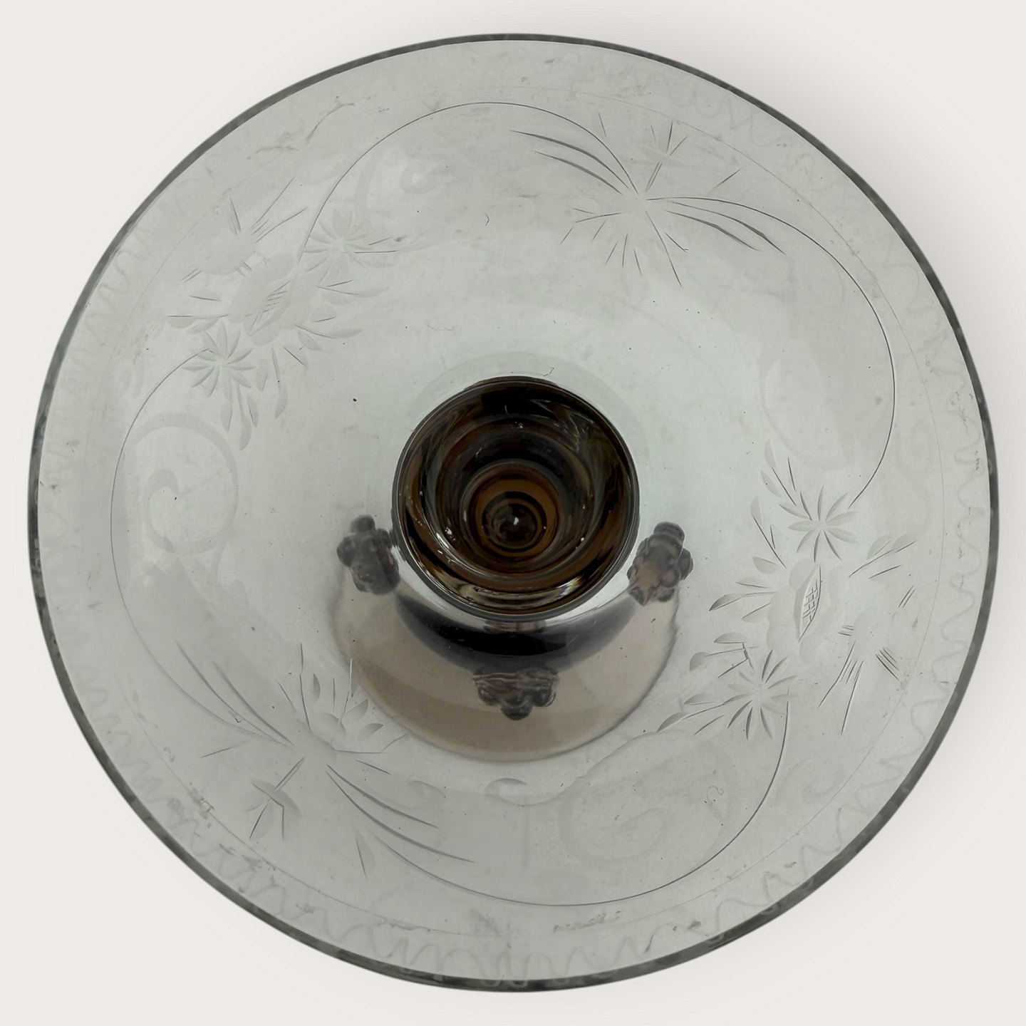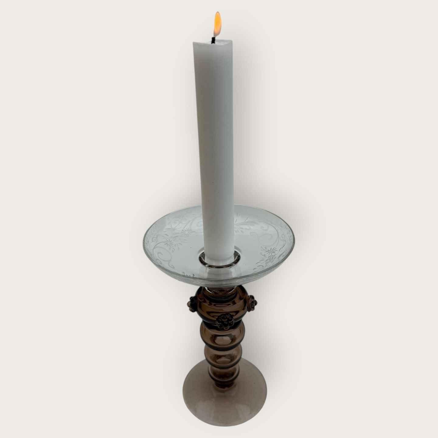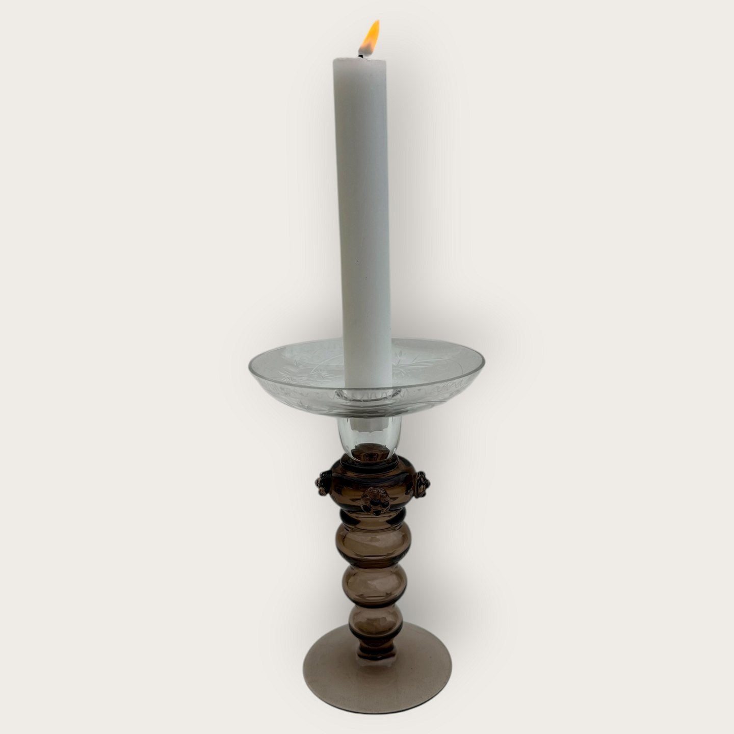 Gammel glaslysestage, hul brun stamme med rosetter, Skål med slibninger affugle, mønster og blomster, flot stand, højde 16,5cm, diameter 11cmLager: 1