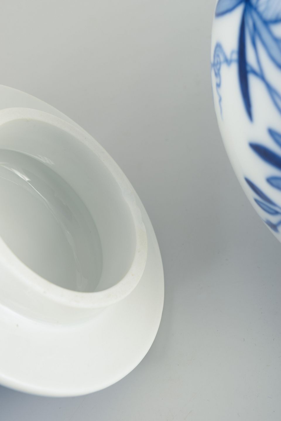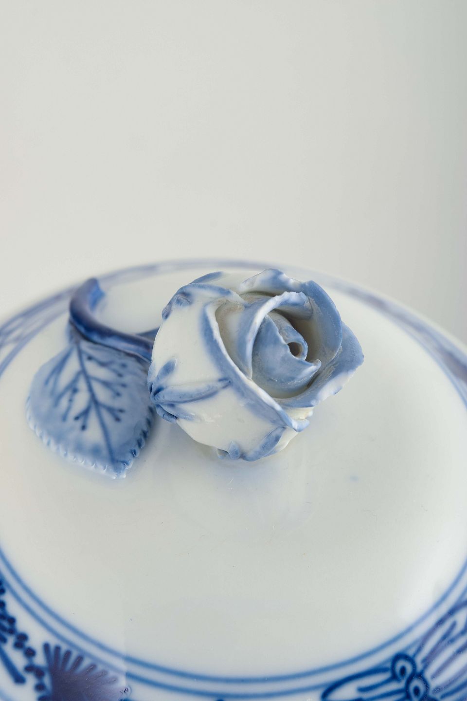 Organisk formet lågkande i hvidt porcelæn med underglasur-blå dekoration i det klassiske “Zwiebelmuster”-mønster. Låget er prydet med en naturalistisk modelleret porcelænsrose i blå og hvid.