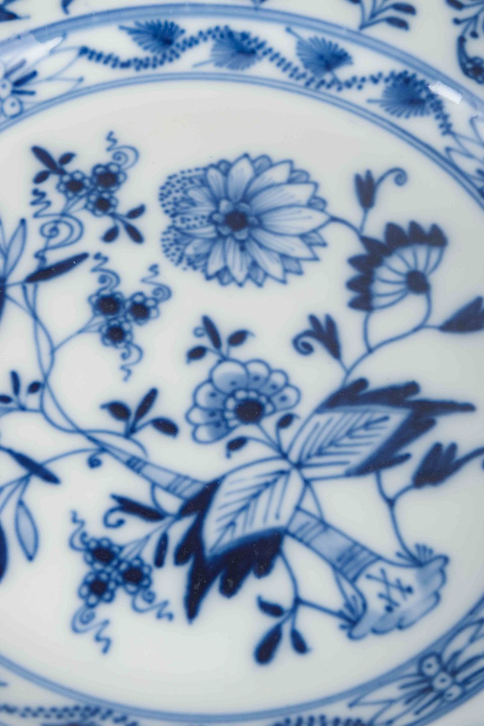 Porcelænstallerkener med den klassiske blå løg-dekoration, håndmalet i blå underglasur. Dekoreret med blomster- og løvmotiver samt bølget kant.