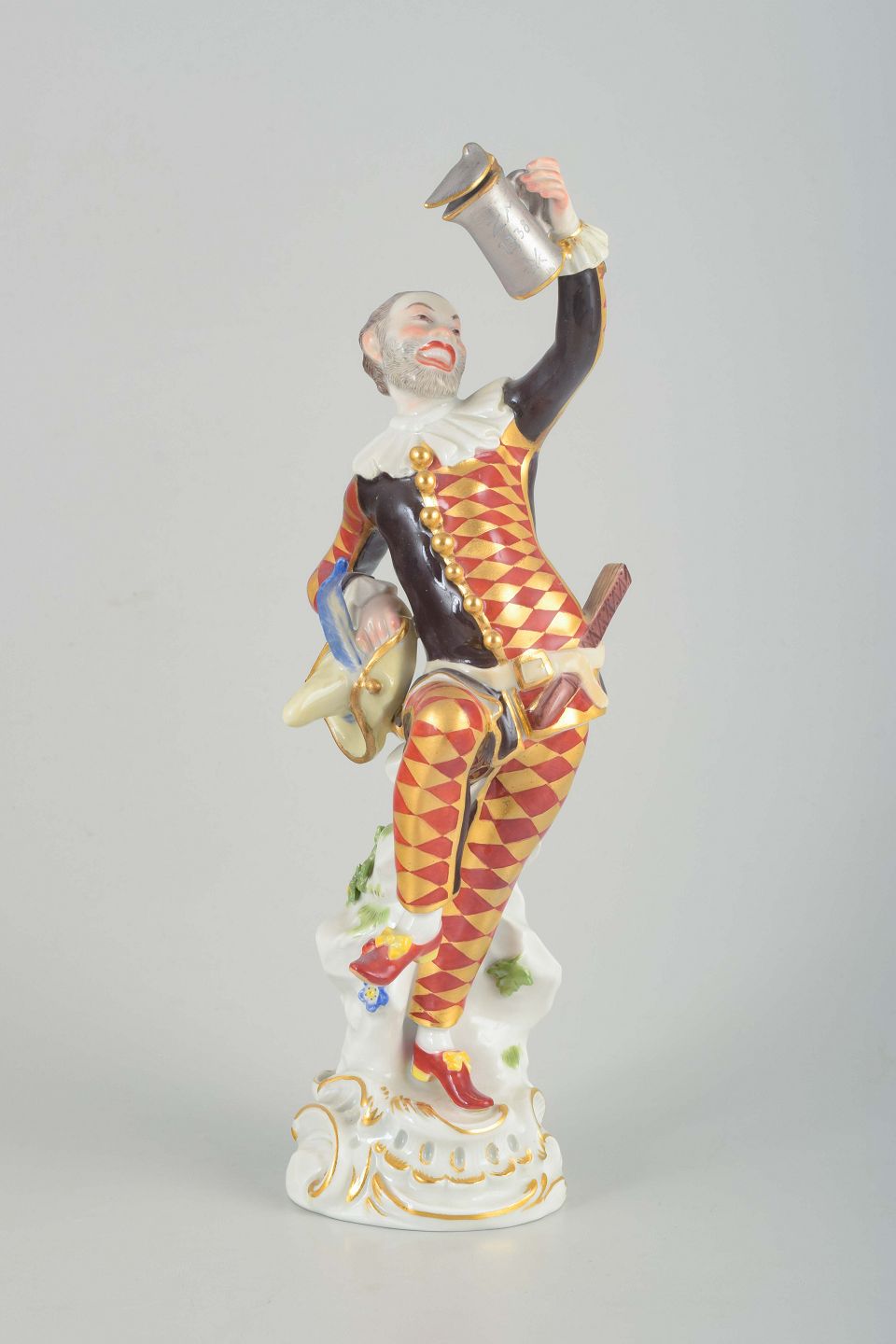 Meissen Porcelænsfigur “Harlekin”.Pragtfuld og detaljerig porcelænsfigur af Harlekin i klassisk Commedia dell’arte-dragt, udført i de fineste farver med overdådig håndmalet staffering i rødt, guld og sort. Figuren skildrer Harlekin i festlig positur med løftet krus, rigt dekoreret med gulddetaljer og stående på en rokoko-inspireret base med blomster.