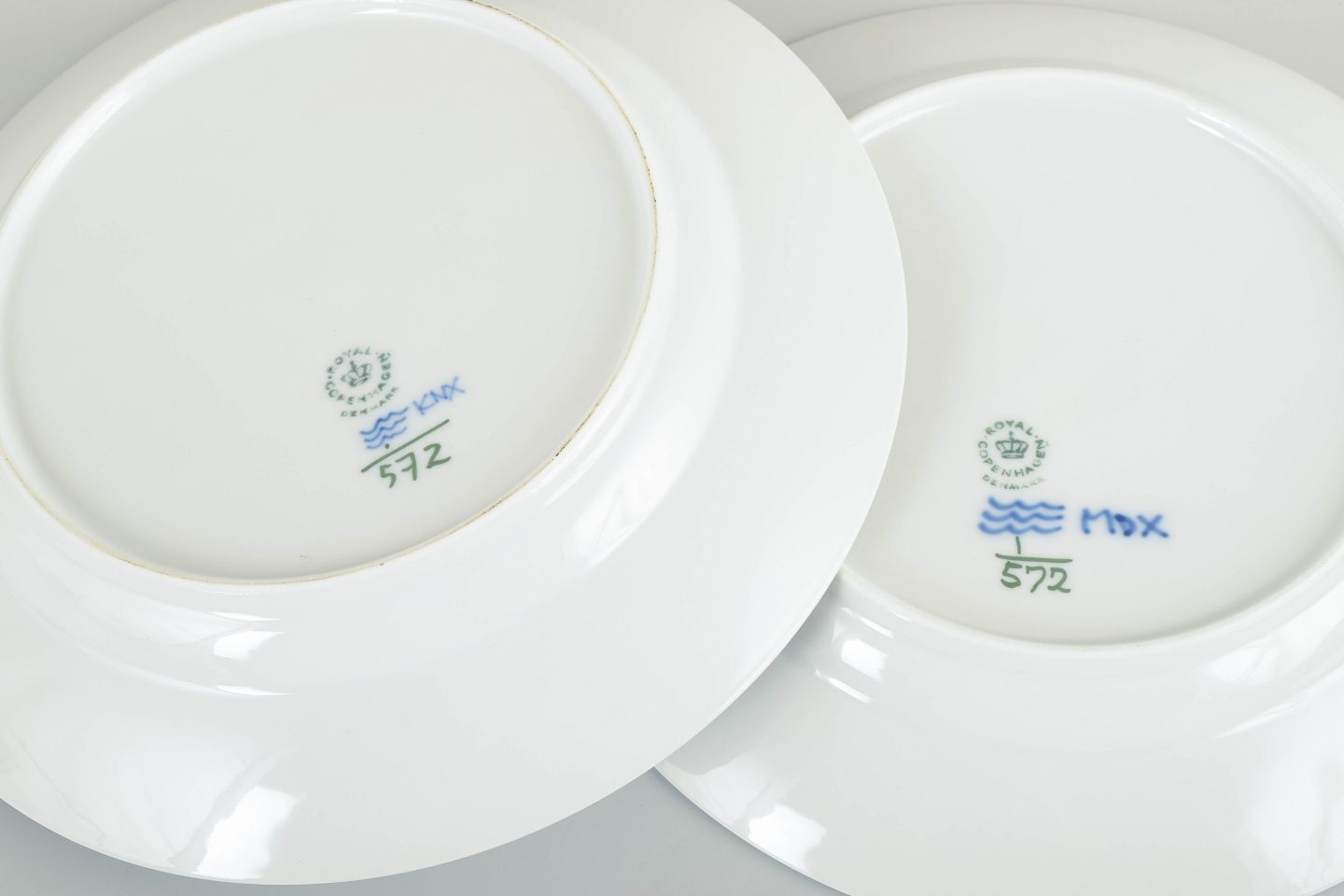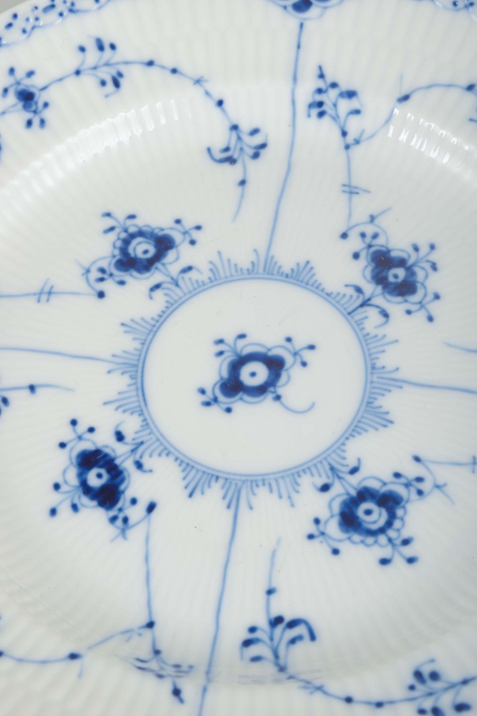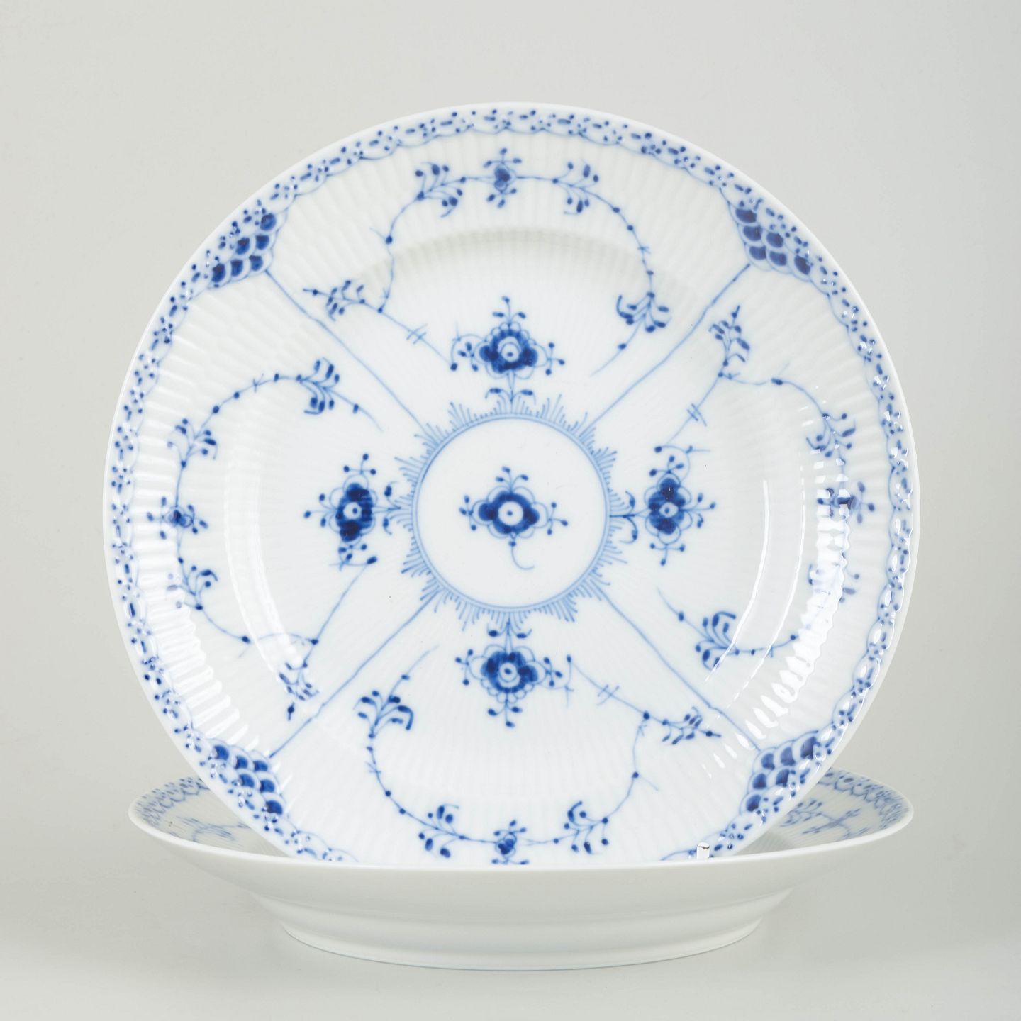 Porcelænstallerkener i hvid med håndmalet, blå dekoration i det klassiske "Musselmalet Halvblonde"-mønster.
