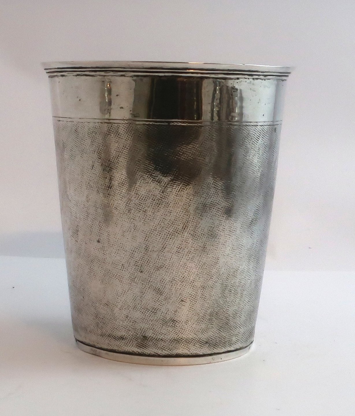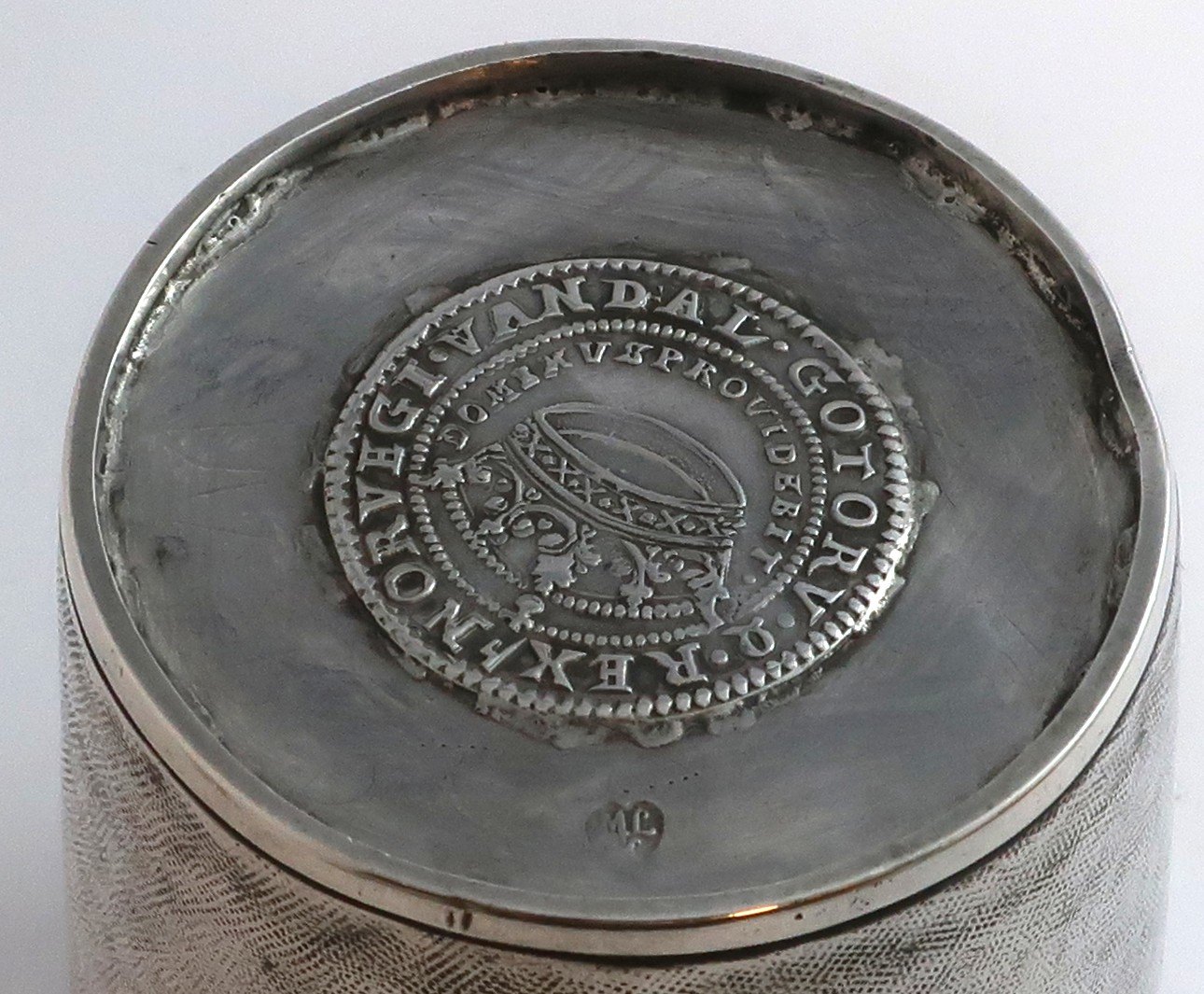 Mogens Thommesen Løwenhertz (1669-1734). Stort sølv bæger. Mønt (Frederik lll krone fra 1651) isat i bunden. Højde 11,5 cm. Diameter 10 cm. Udstiller