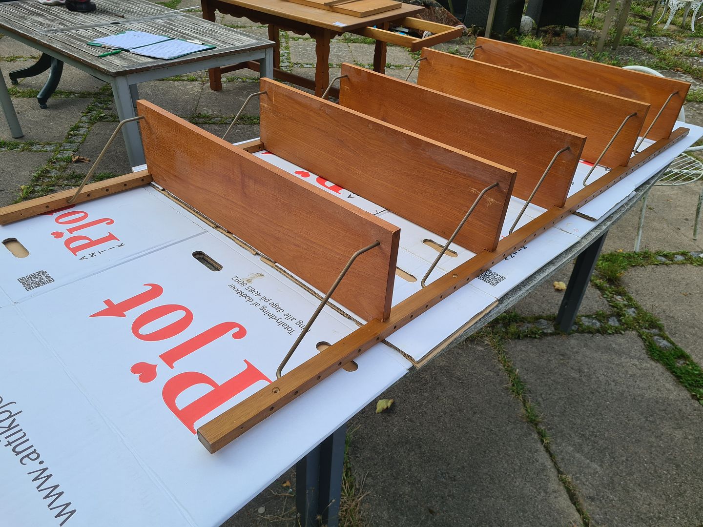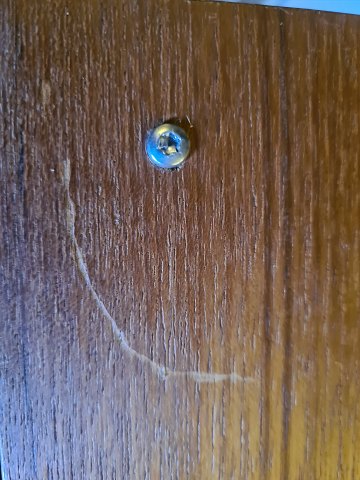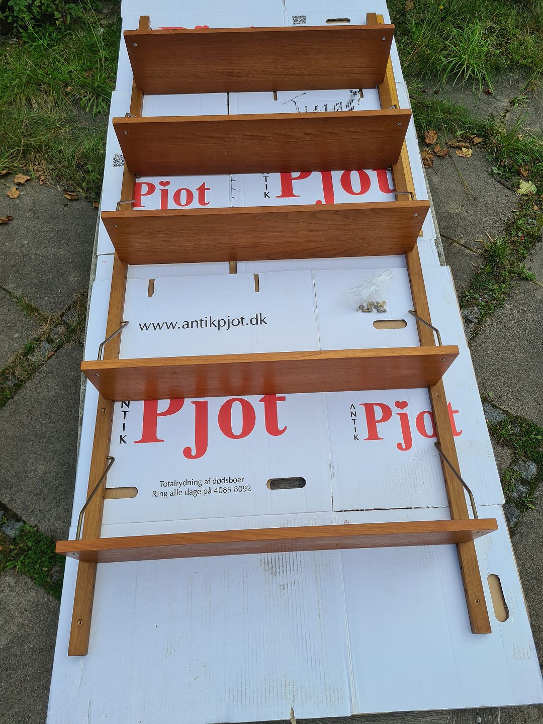 Reol til ophængning på væggen fra 1960'erne i finéret teak. Består 5 hylder á 80 x 20 cm. og 2 vanger á 198 cm. Pænt og ok velholdt dog med lidt brugsspor i form af overflade skrammer og uoriginale skruer. (Billede)