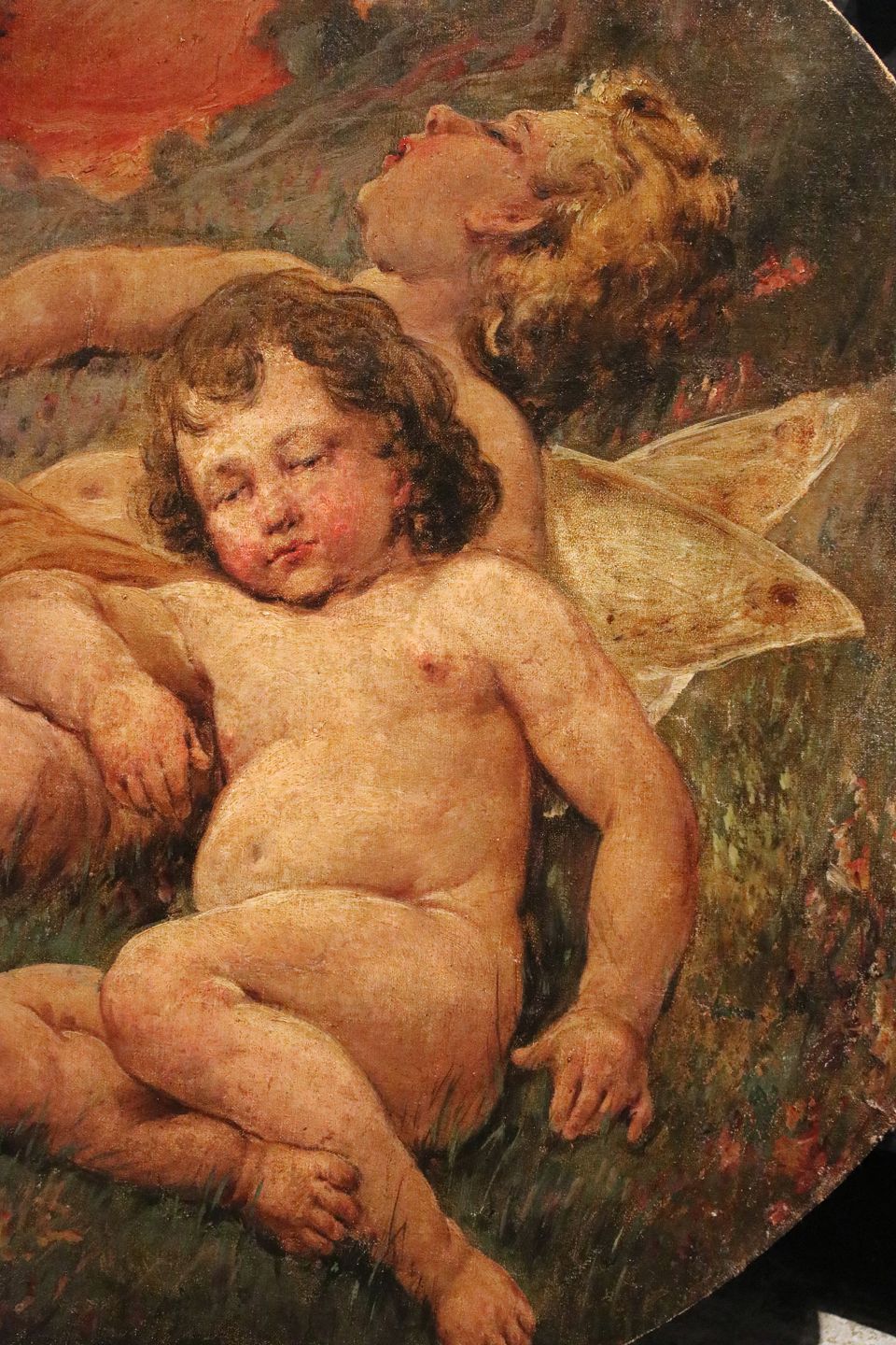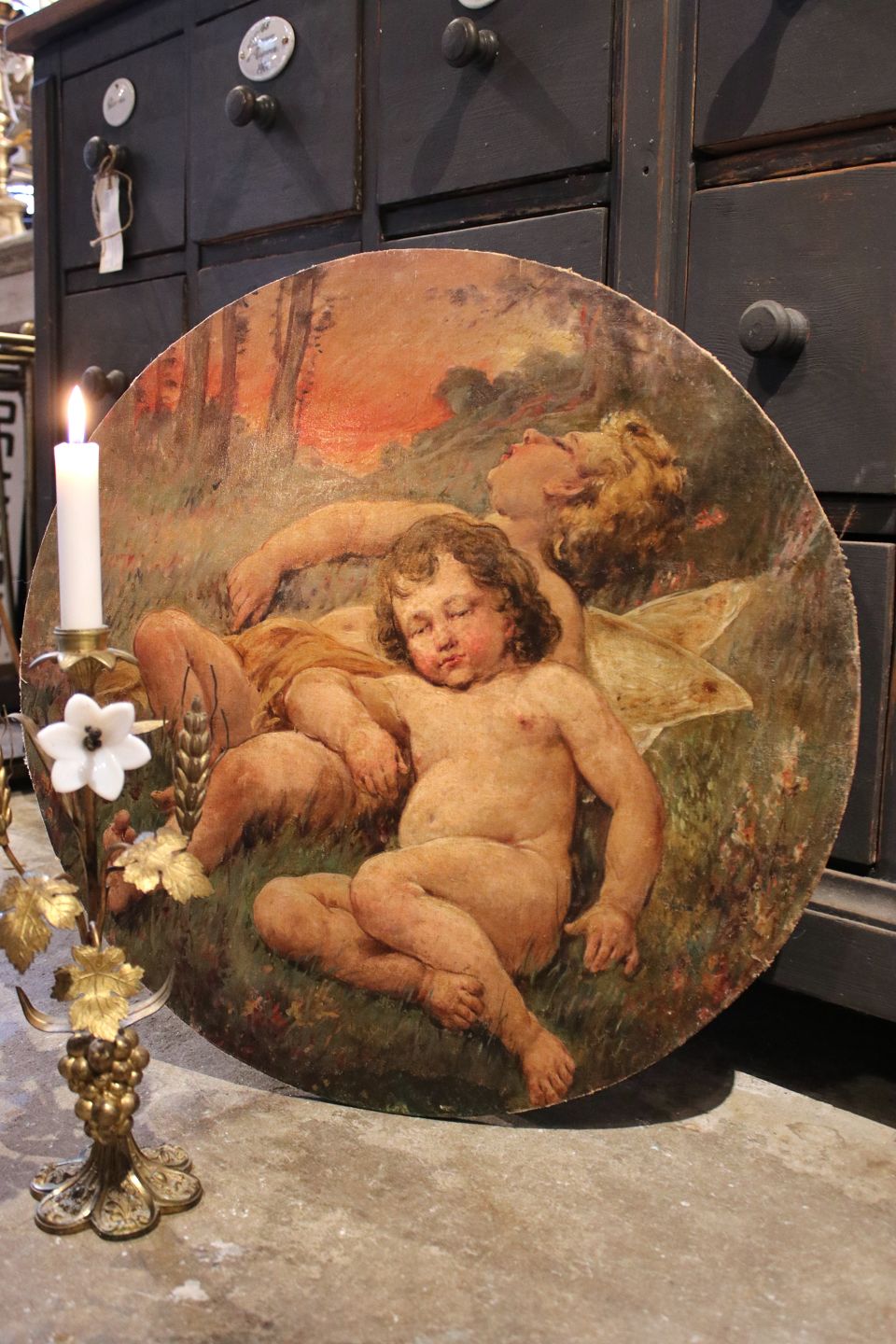 Gammelt fransk 1800 tals olie maleri på lærredmed motiv af 2 små engle.