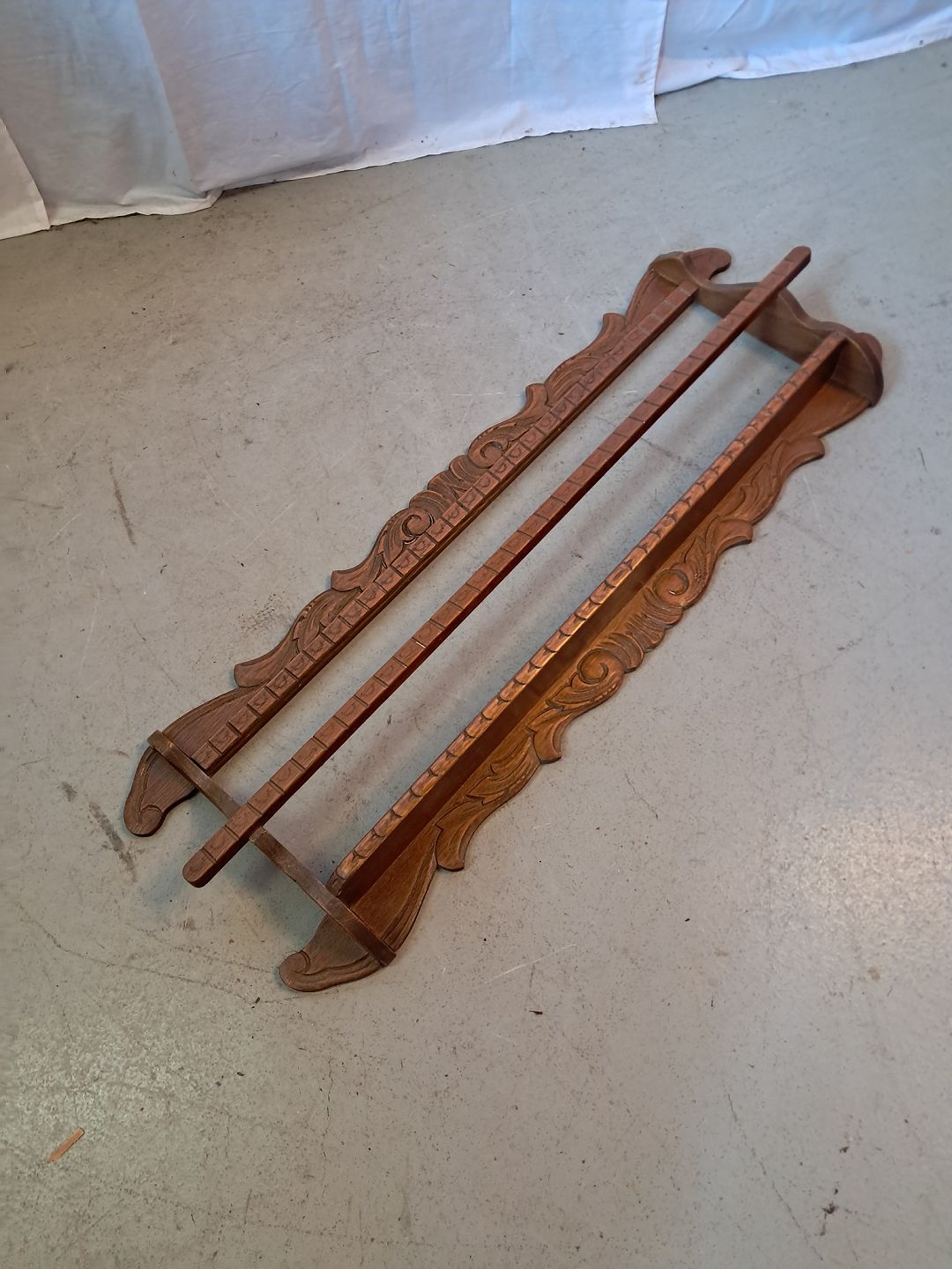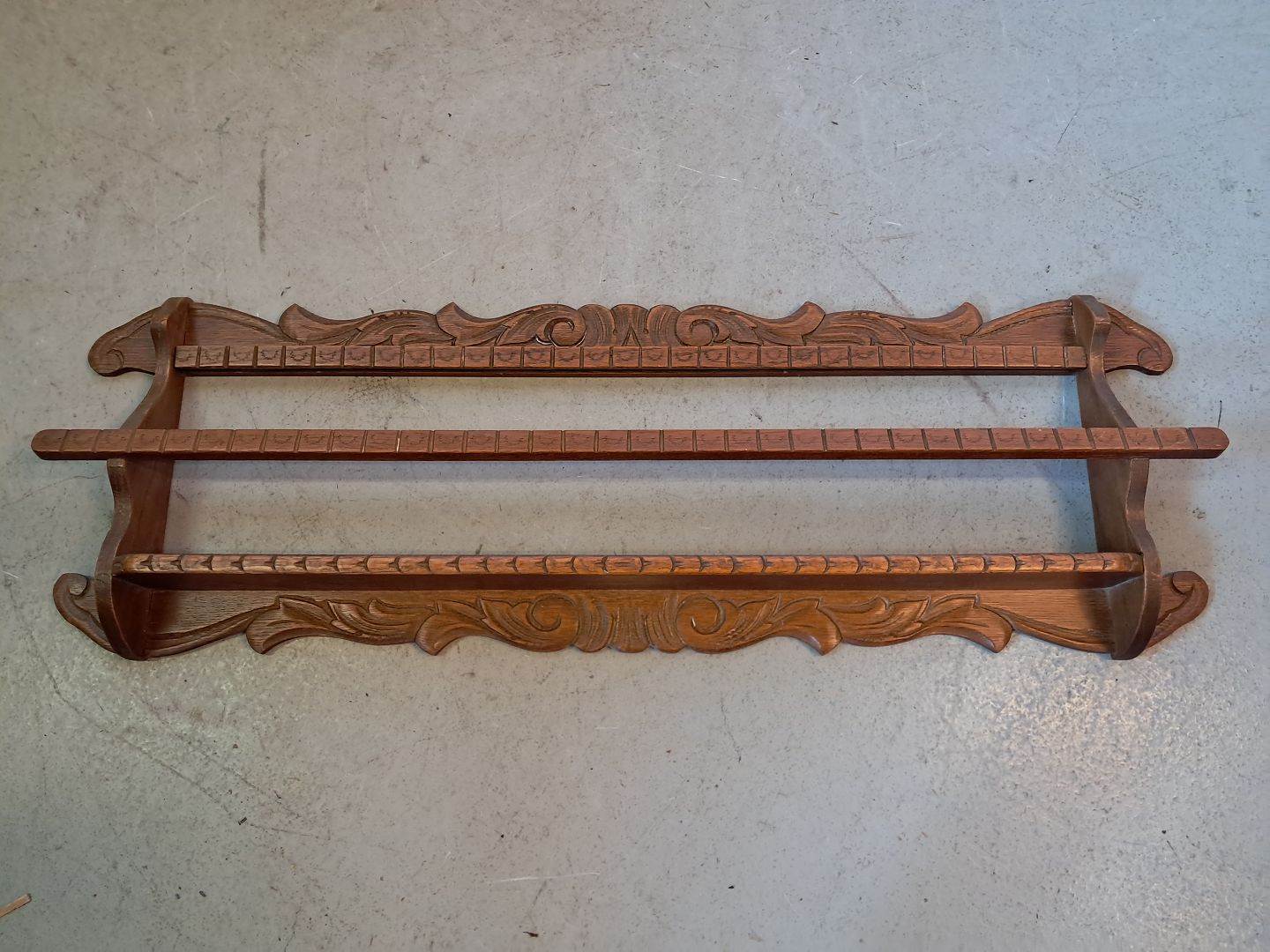 Tallerkenrække i massivt egetræ, fra 1950erne.Den har brugsspor.