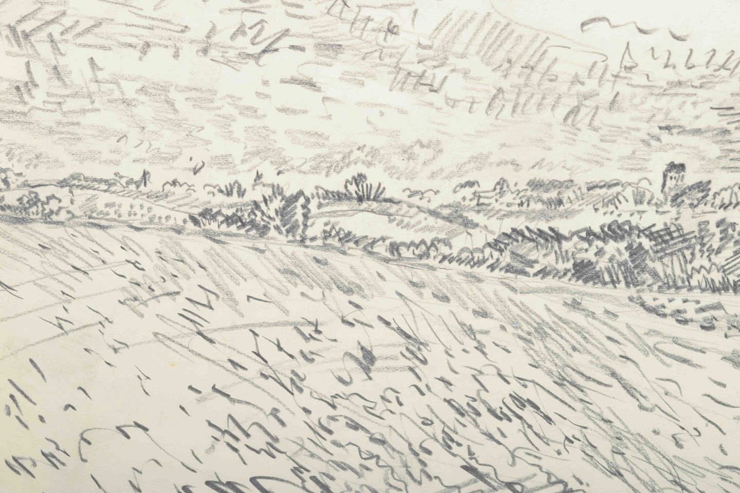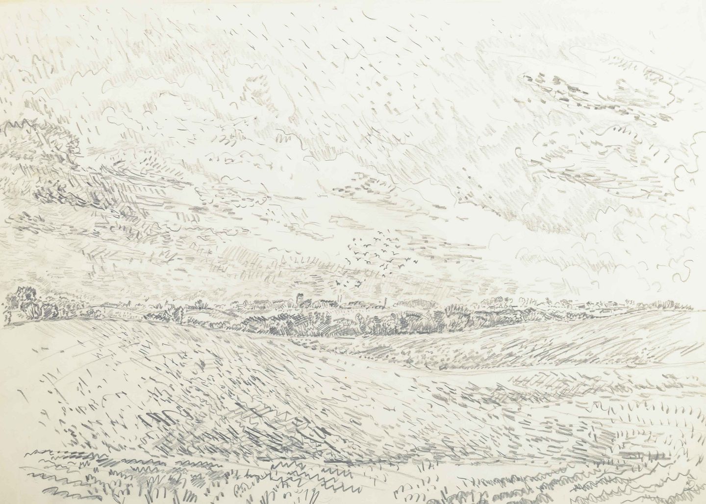 Et stemningsfuldt landskab udført i blyant, hvor horisonten og himlen dominerer billedet med rolige, rytmiske streger. Værket indfanger naturens bevægelse og atmosfære med en enkel, men levende stregføring.