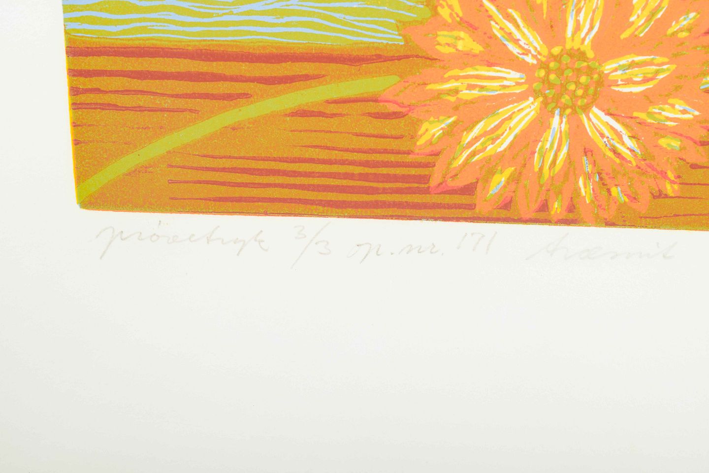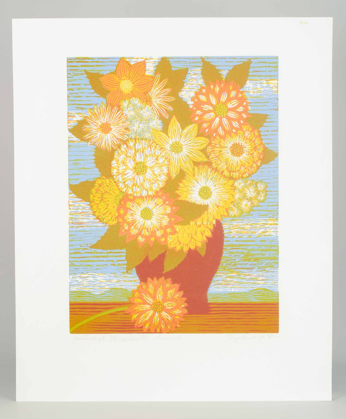 Et dekorativt og farverigt motiv med en buket blomster i vase. Kompositionen er præget af varme gule og orange nuancer, der giver værket en livlig og solrig stemning. Den grafiske enkelhed og klare farveflader fremhæver motivets dekorative karakter og skaber et harmonisk udtryk.