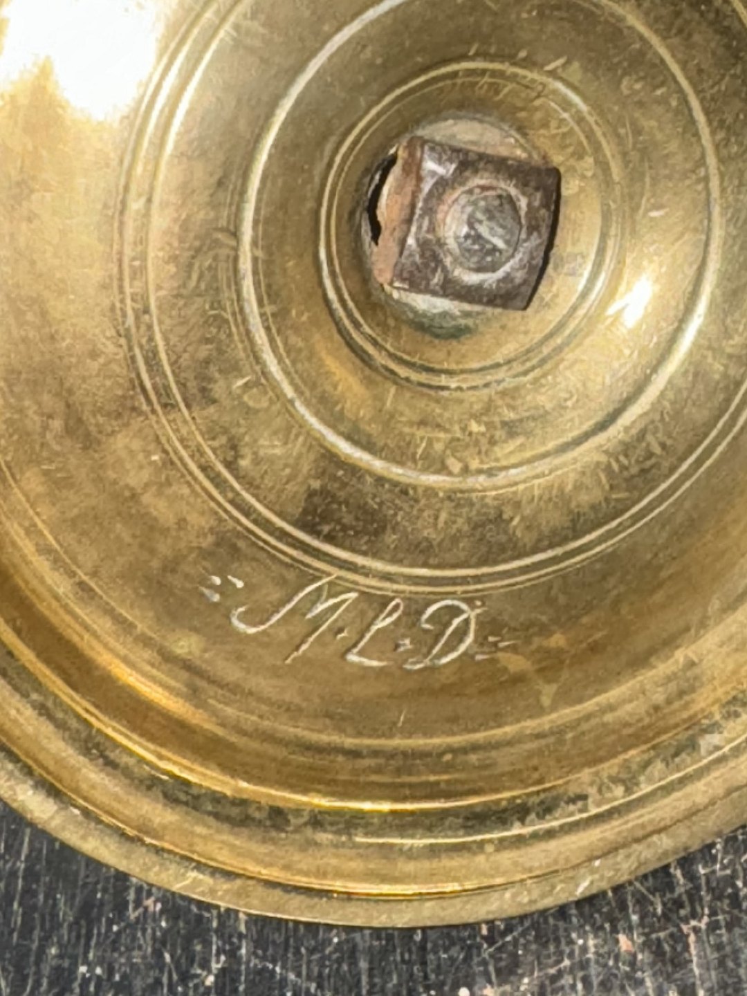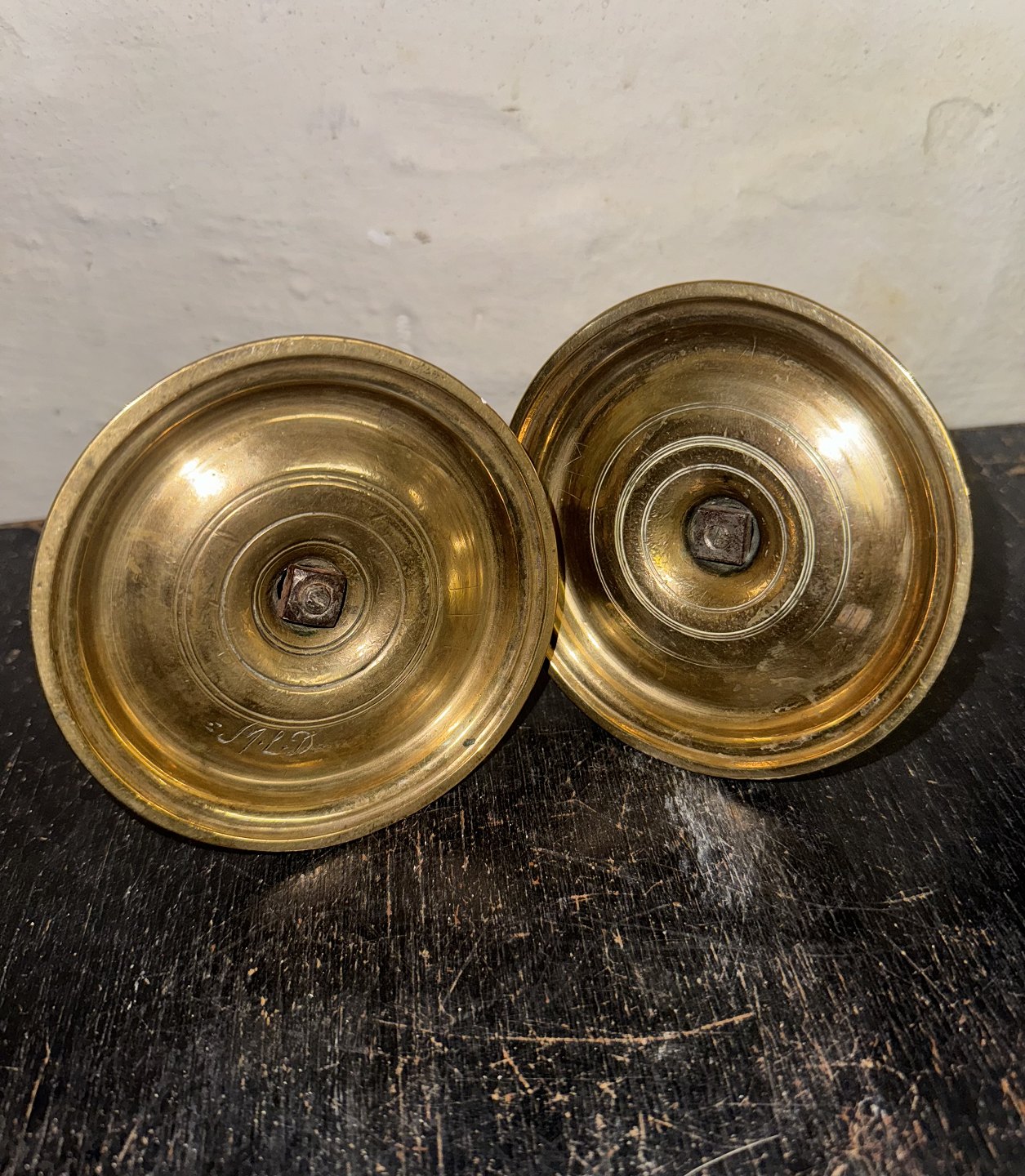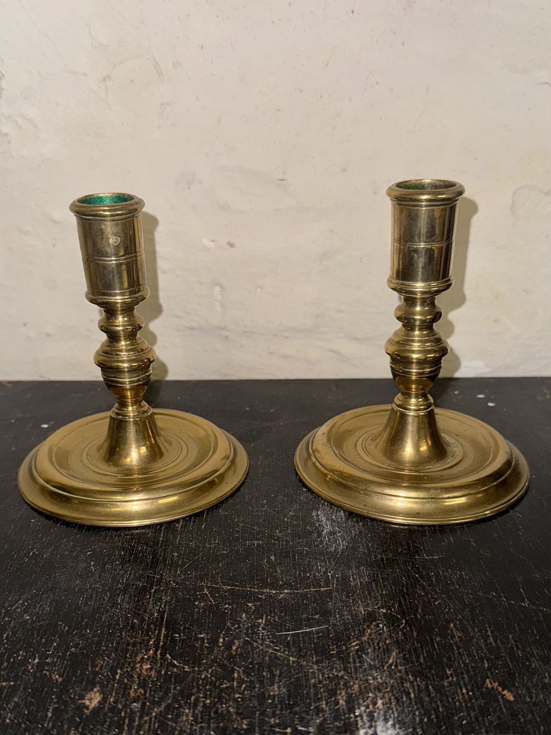 Par lave lysestager i messing fra anden halvdel af 1700-tallet (18. Århundrede). Fremstår i perfekt stand. Den ene graveret på bunden med initialerne MLD. Mål: H. 12,5 cm bundens diameter er 10,5 cmv/ Jesper Reutemann