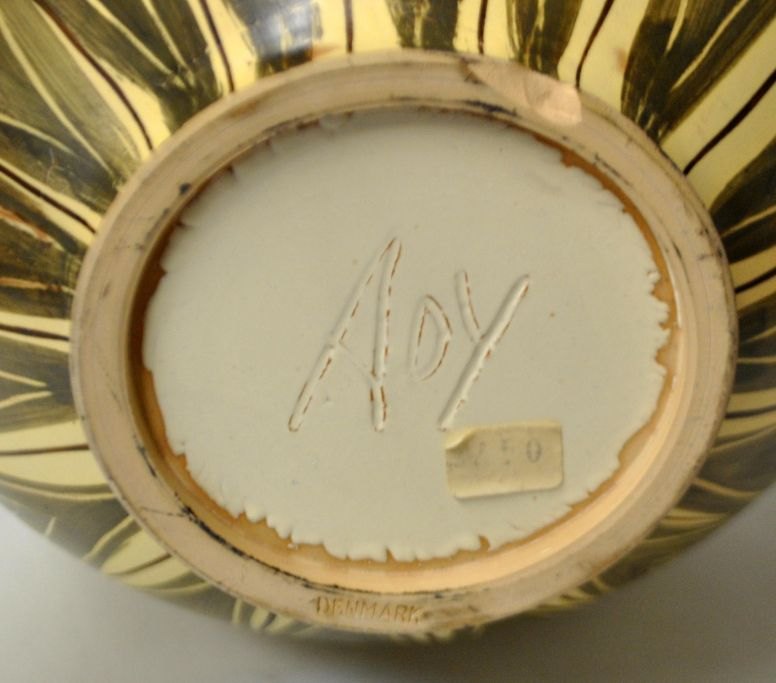 Krøyer, Ady (1933 - 2016) Danmark: Keramisk bordskål. Rødler med gul, grønne og brune glasurer. Dekoreret udvendig med bladmønster. I bunden - antagelig frø dekoration. Indvendige sider dekoreret med stregmønster. Signeret: Ady, Denmark. H.: 16 cm. Dia.: 24,5 cm.NB: Mindre afslag på standrand.