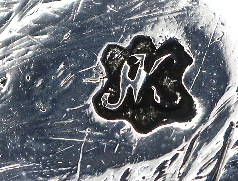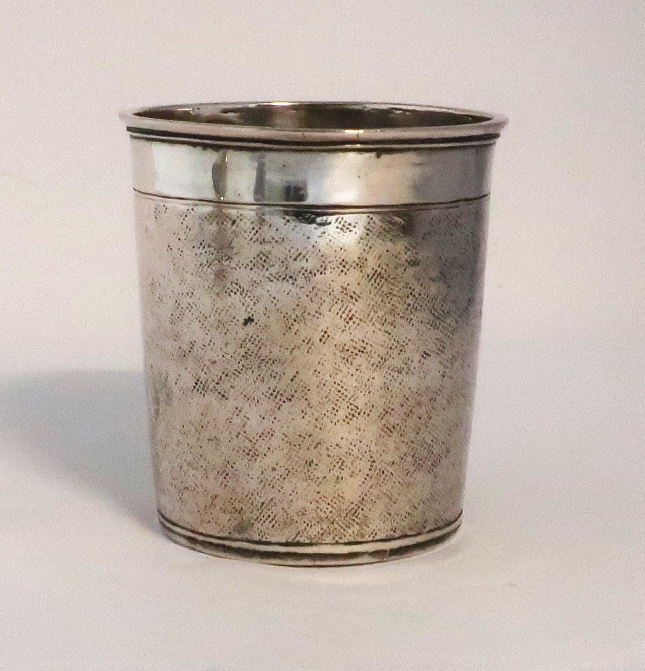 Anders Jensen Klem, Ringkøbing & Holstebro og Lemvig. Nålepunslet sølv bæger med indskription fra 1718. Højde 7 cm. Diameter 6,5 cm
