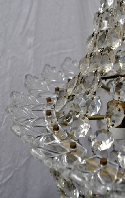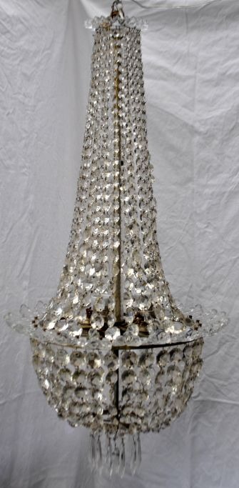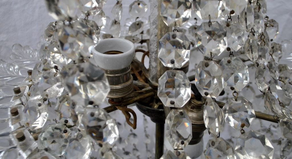 Antik prisme lysekrone. 19. årh. Danmark. H: 94 cm. Dia: 46 cm. Med 995 prismer samt glas top og glas stang. Til fem elpærer i porcelænsfatninger.Perfekt stand!