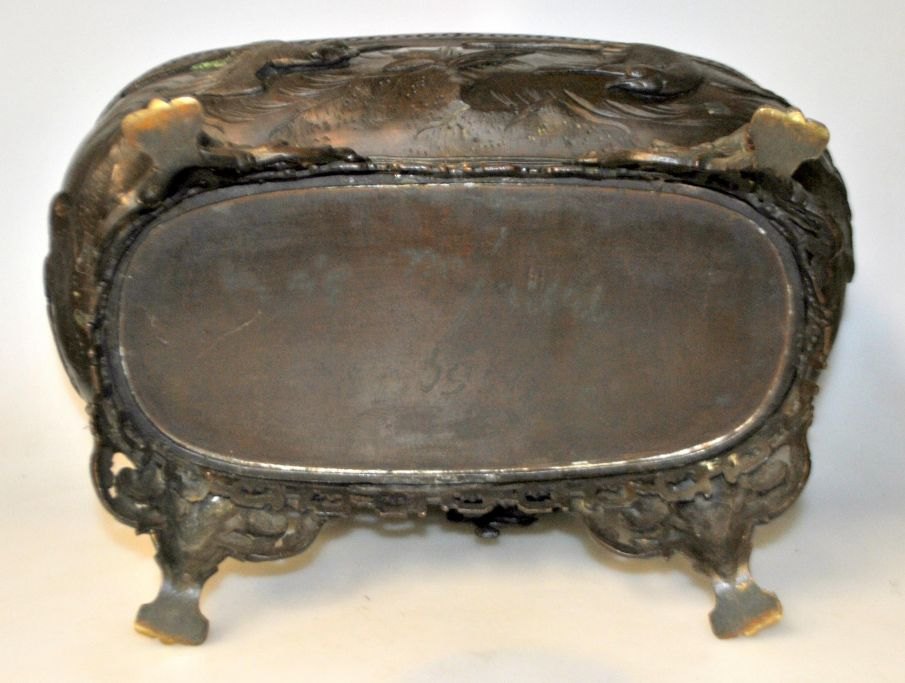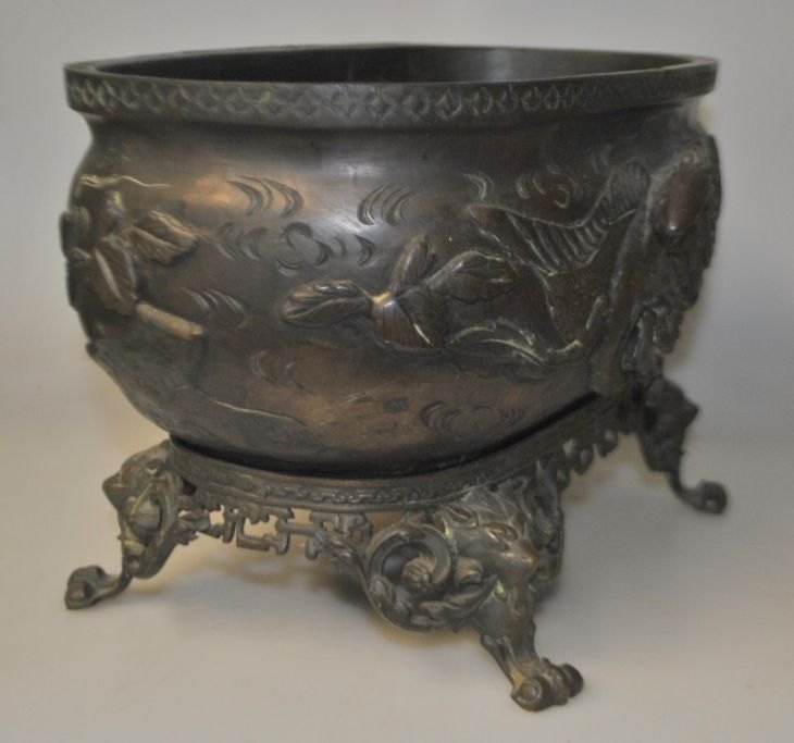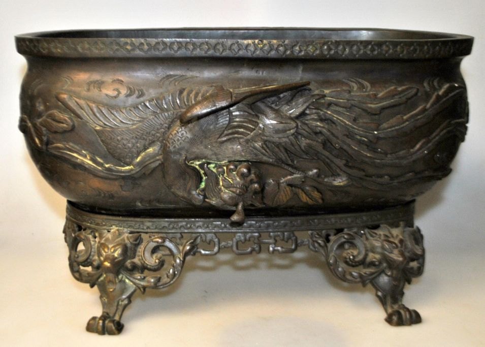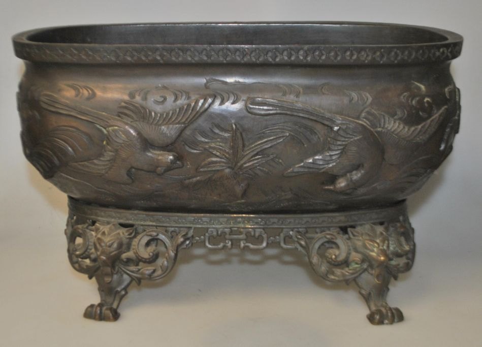 Stor kinesisk bronze blomster jardiniere, 19. årh. På fire løvefødder. Med kantdekorationer. Sider dekoreret med stor drage og fugle. L.: 32 cm. B.: 19 cm. H: 18 cm.Perfekt stand!