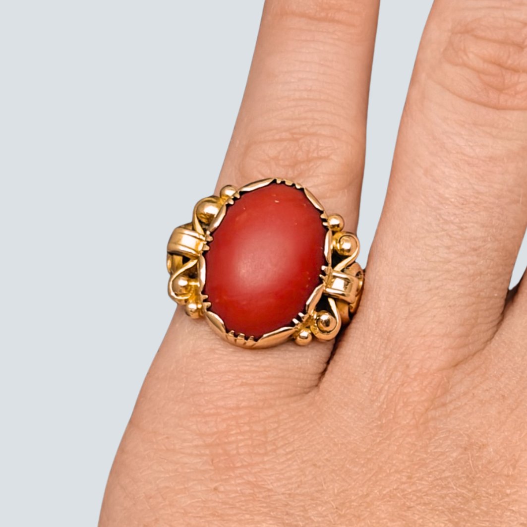 Ring i 14 guld med oval koral. Ringen er fra omkring 1920.Ring størrelse 49.