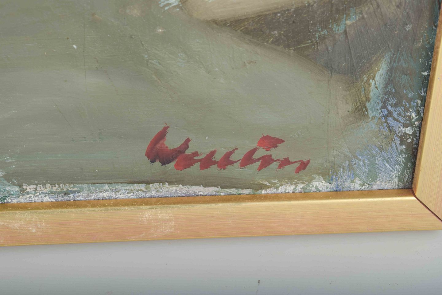 Et modernistisk landskabsmaleri med geometrisk-abstrakte former og en monumental bygning centralt i kompositionen. De brede penselstrøg og afdæmpede farver understøtter værkets stoflige og arkitektoniske udtryk.