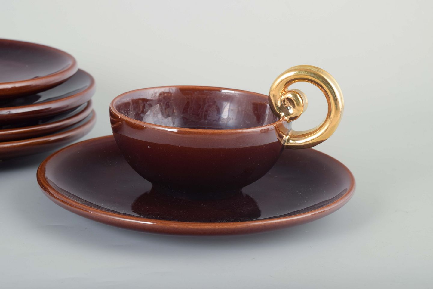 Teservice i glaseret keramik med dyb bordeaux farve og karakteristiske håndtag i forgyldt keramik. Bestående af tekande, sukkerskål, fem kopper med underkopper samt fem tallerkener.