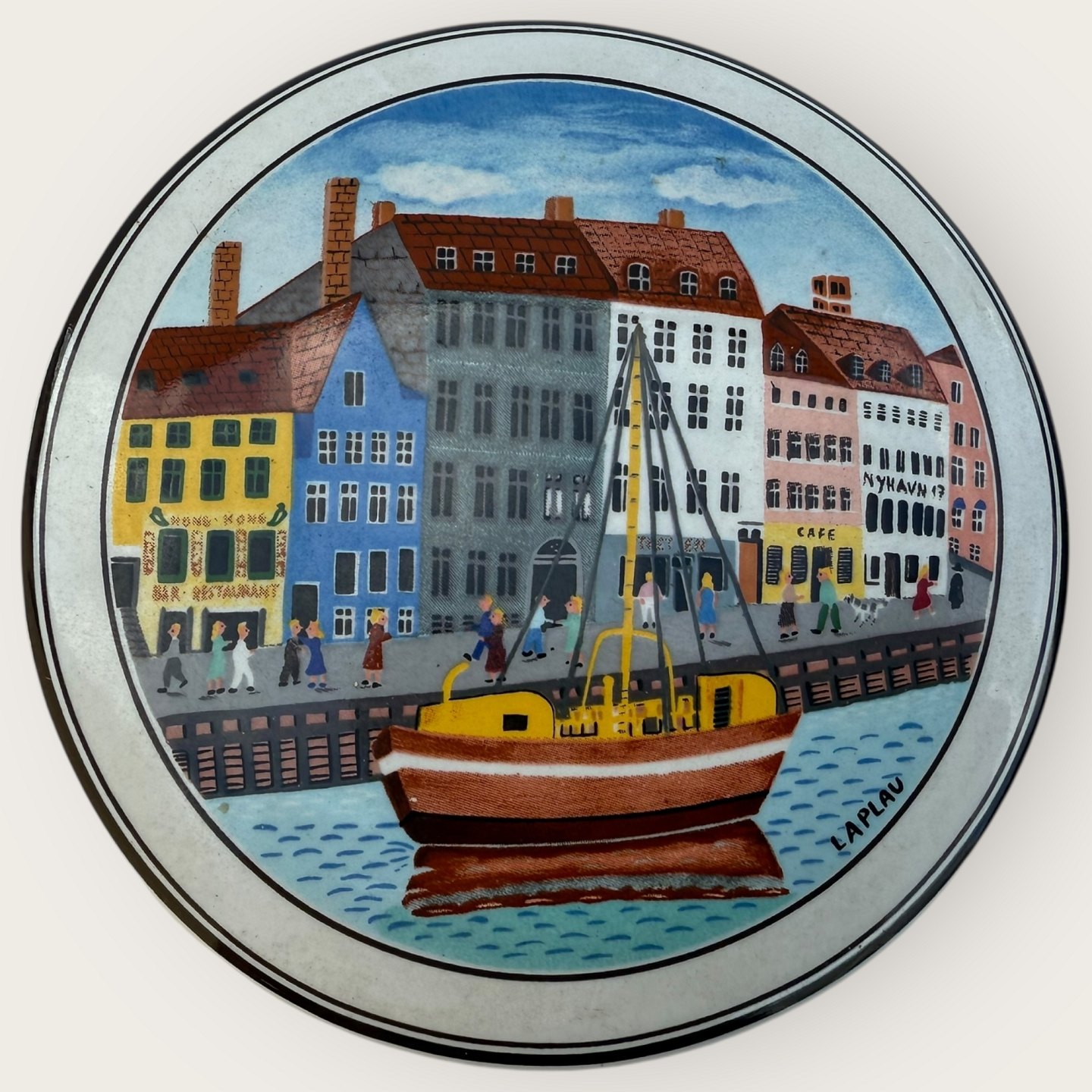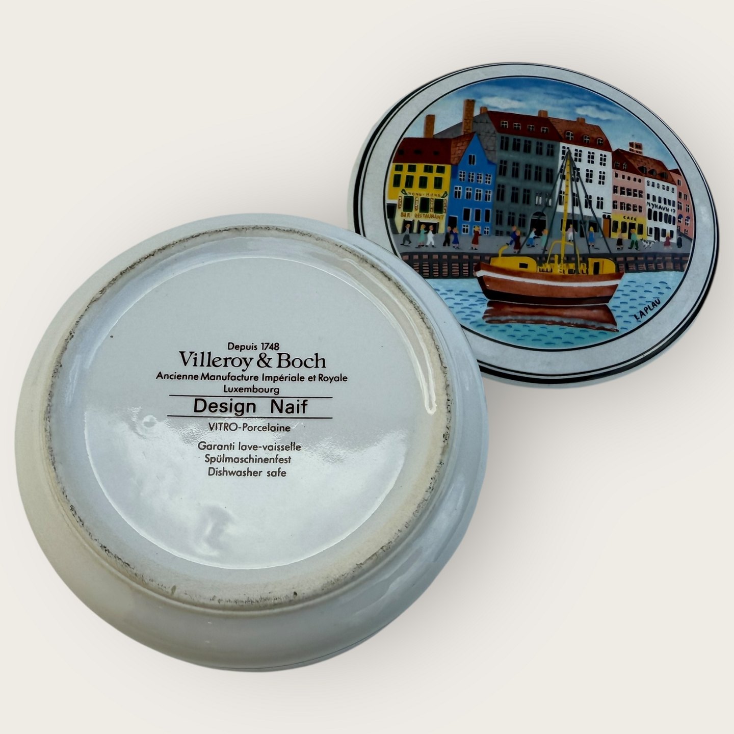 Villeroy & Boch, Design Naif, Laplau motiv fra Nyhavn, lille lågkrukke, diameter 10cm, højde 5cm *pæn stand*Lager: 1