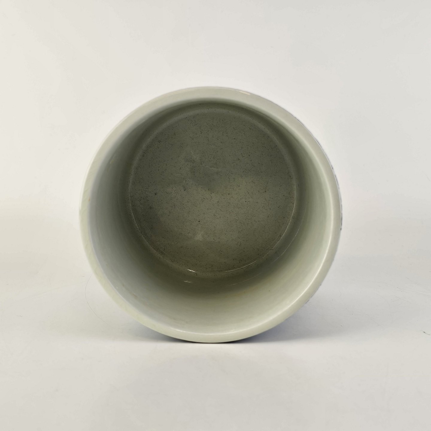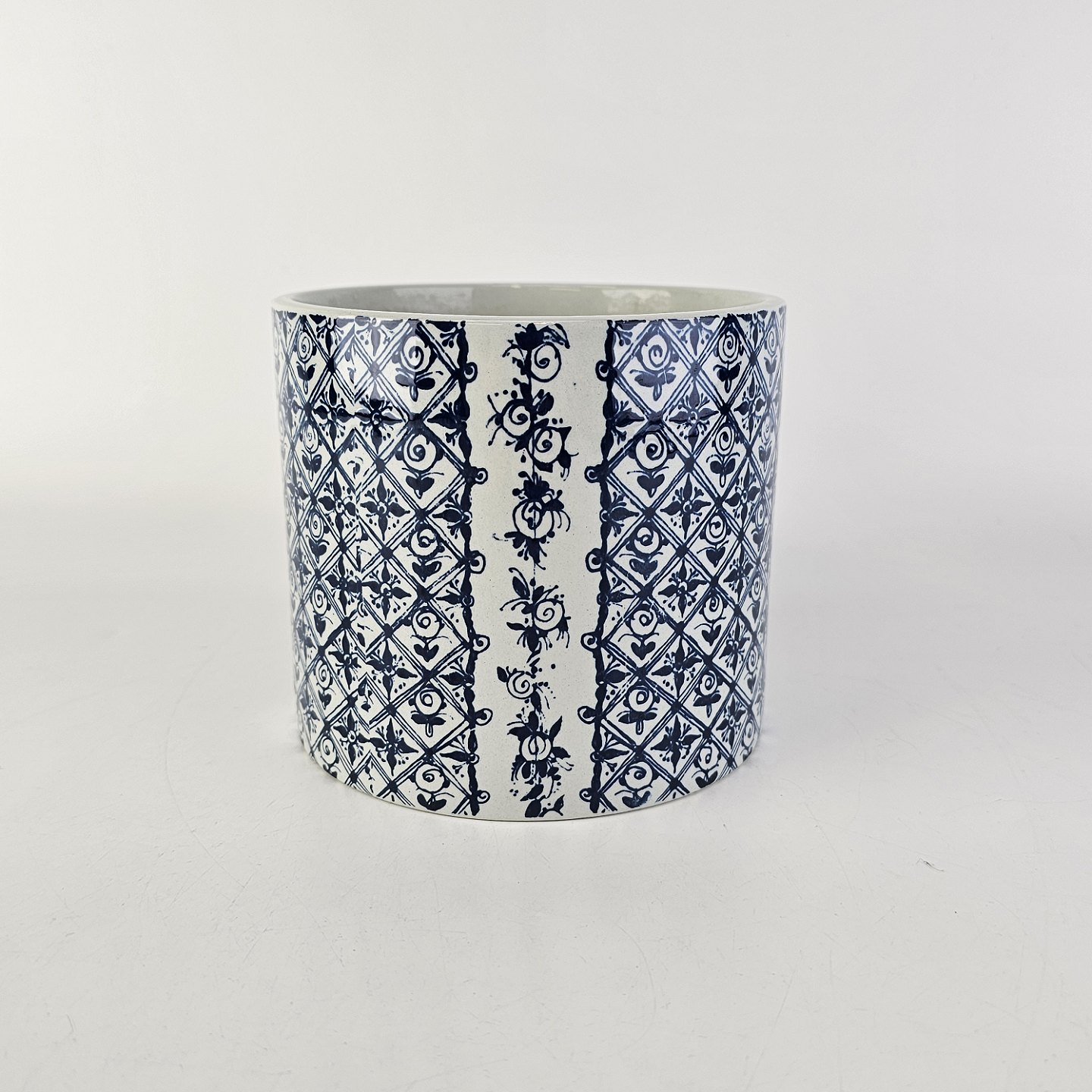 Urtepotteskjuler af keramik med et sort/hvidt mønster af en kvinde og blomster og teksten KolerikerNo 3023-698