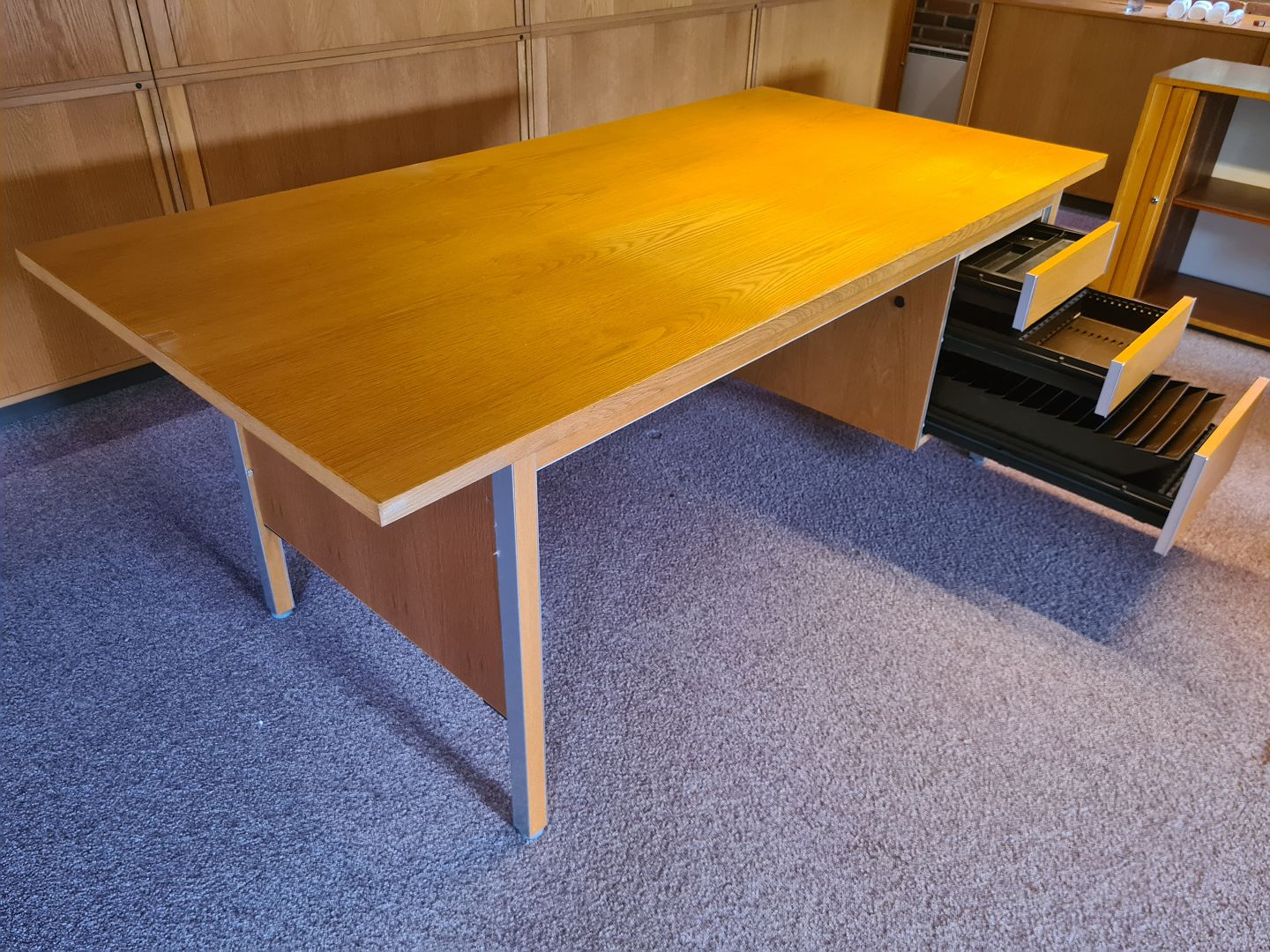 Stort Skrivebord fra 1980'erne i eg og aluminium. Fremstår pænt, velholdt og udmærket funktionsdygtigt. Dog med meget let afblegning på bordpladen efter en skrivemåtte. (Ses på billede)Højde 74 cm. Bredde 120 cm. Dybde 45 cm.