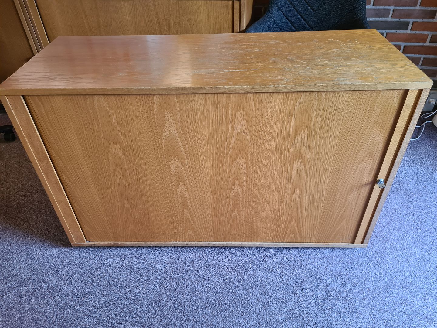 Arkivskab fra 1980'erne i finéret eg med jalousi låge. Fremstår pænt og velholdt, dog med lettere brugsspor på toppen. (Billeder) Forskellige indretningsformer haves. Fungerende nøgle medfølger.