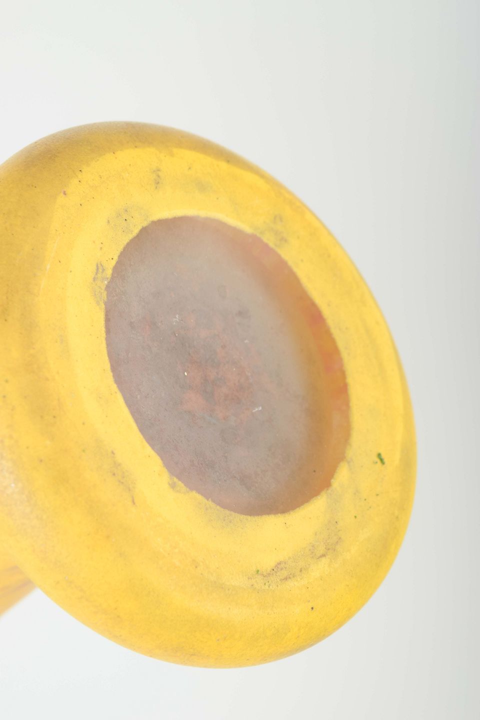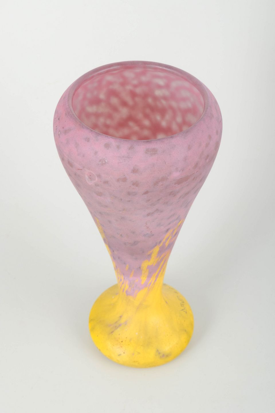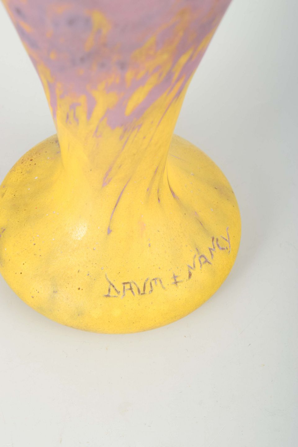 Organisk formet glasvase i matteret glas med flerfarvet dekoration i lilla og gule nuancer. Indgraveret signatur ”Daum Nancy” ved foden.