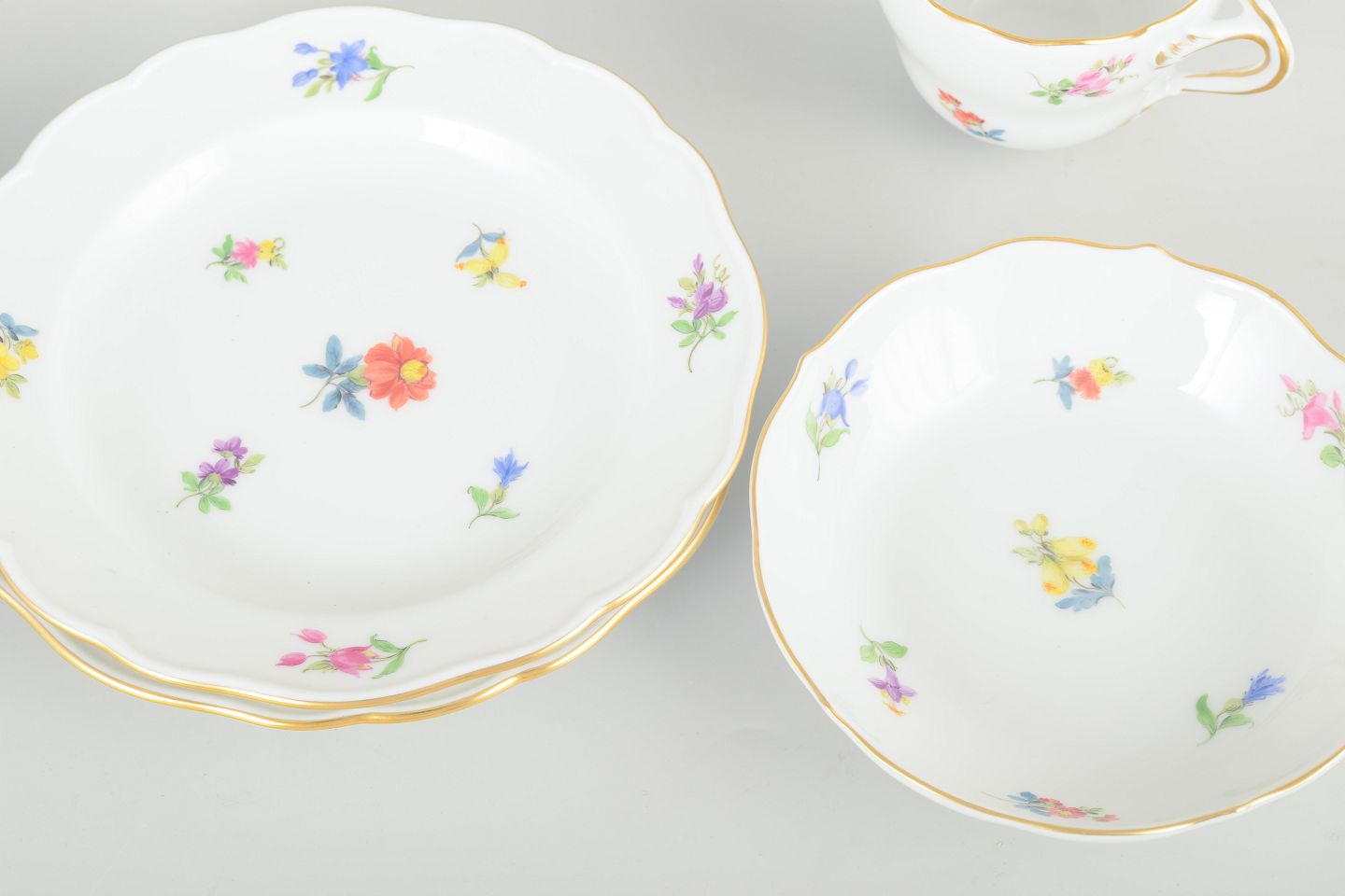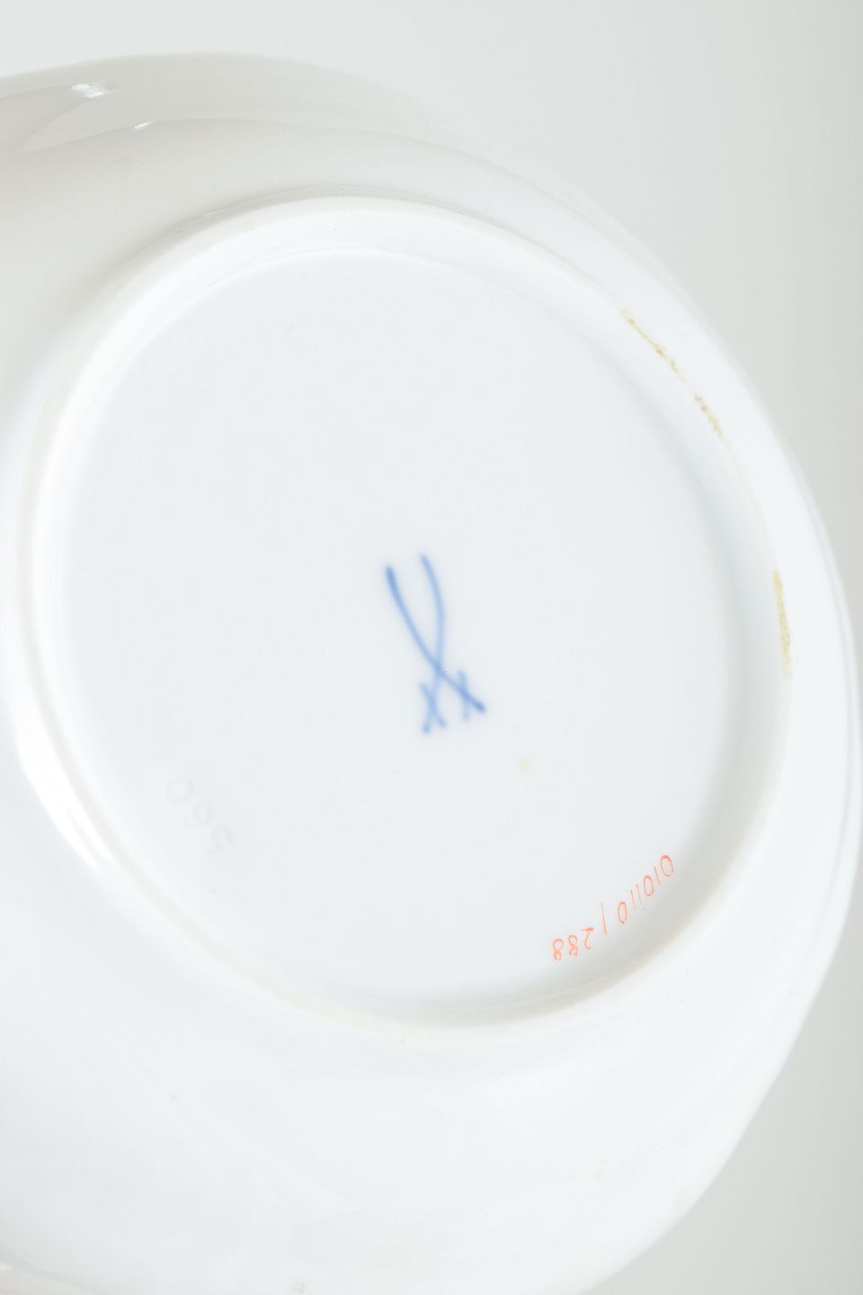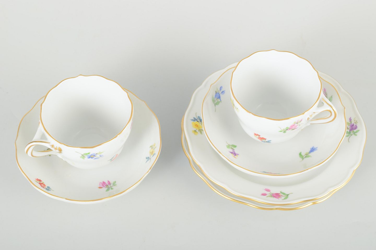 Sæt bestående af 2 håndmalede mokkakopper med underkopper og små tallerkener. Porcelænet er dekoreret med flerfarvede blomster og forgyldte kanter. Klassisk Meissen-form med svungne linjer.