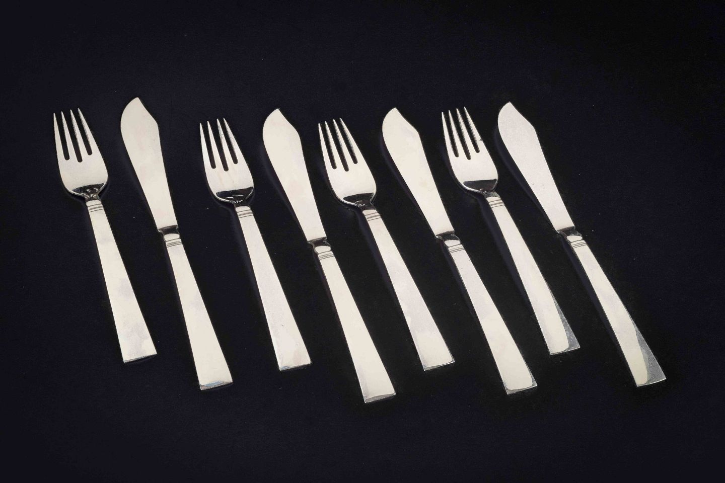 Sæt bestående af 8 dele fiskebestik til 4 personer i det elegante “Blok / Acadia”-mønster, designet af Harald Nielsen i 1918. Hver kuvert består af en fiskekniv og en fiskegaffel. Mønstret er karakteriseret ved en stram, funktionalistisk formgivning med glatte flader og geometriske proportioner.