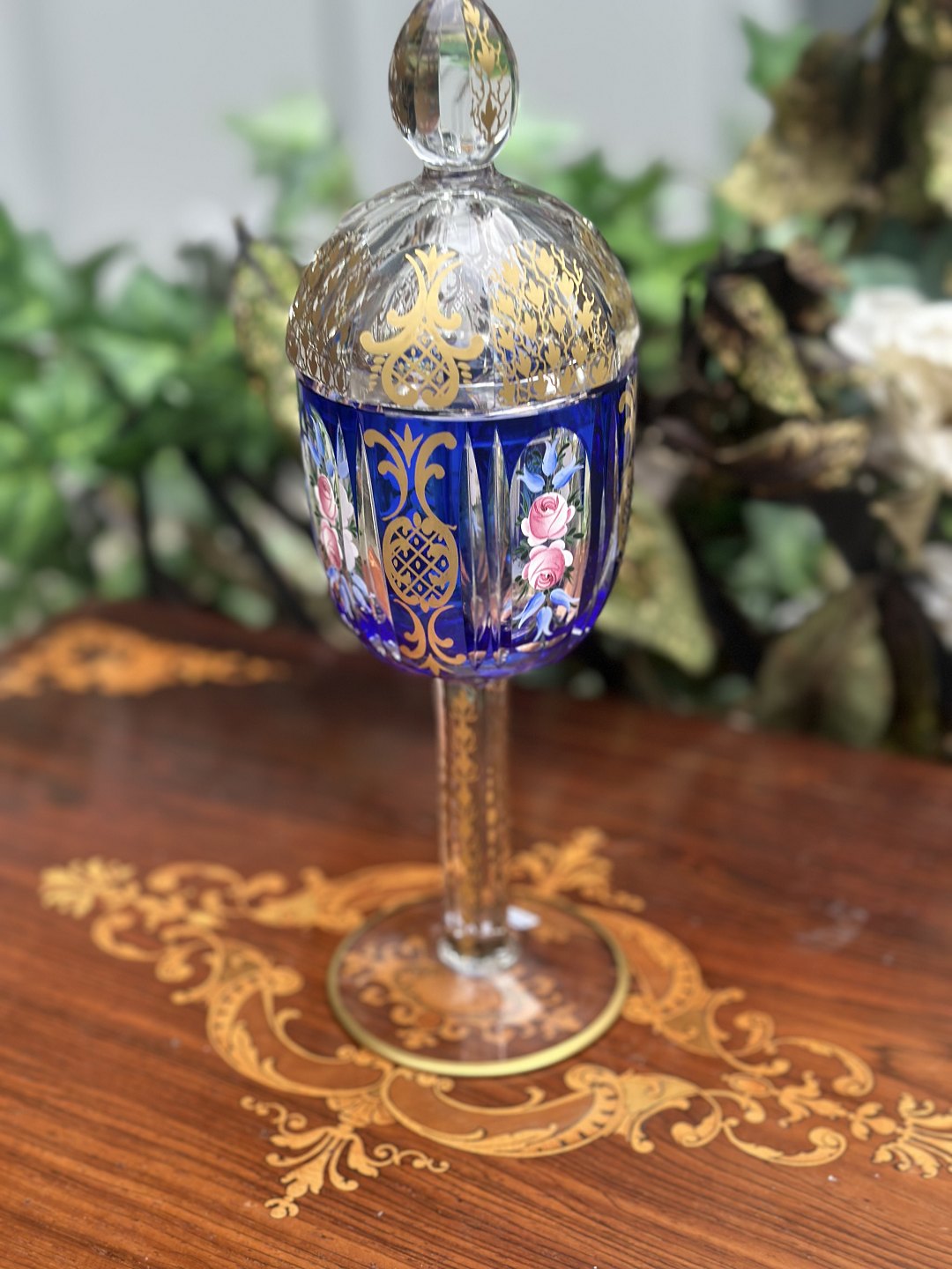 Bohemia krystalbæger med låg på lavet i overfangsglas , håndslebet blykrystal , emalje og guld , fra rokoko tide, fremstilling 1950-1970Højder 18 cm