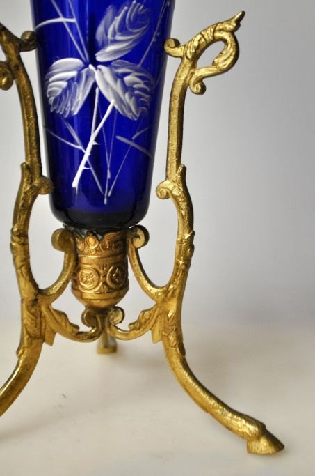Antik cobolt blå vase med emaljemaleri, 19. årh. Tyskland. Monteret i bronze stativ. H.: 28,5 cm.Emne nummer: 28405