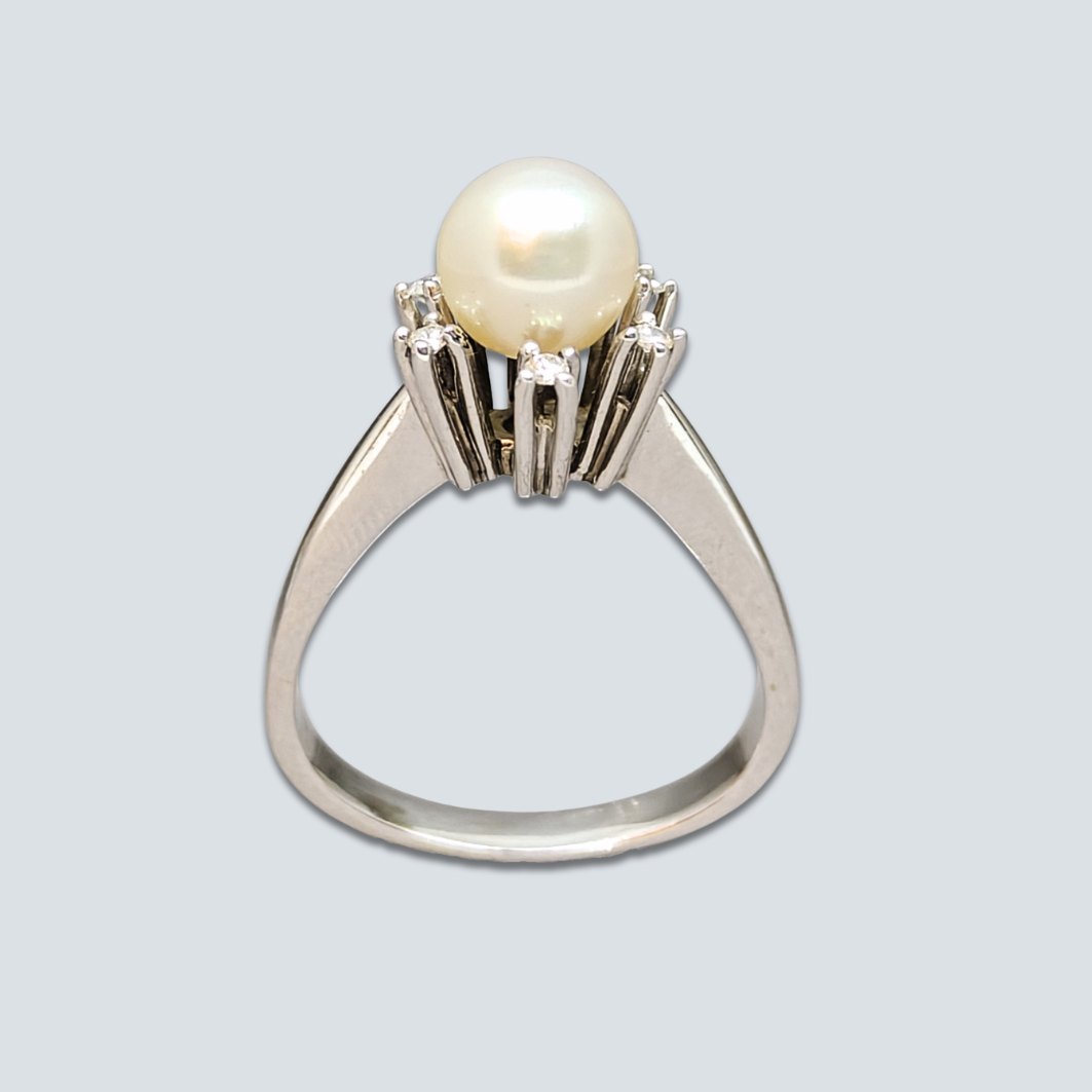 Ole Lynggaard; Ring i 18 kt. hvidguld, med perle omkranset af diamanter.Omkring ring str. 54-55.