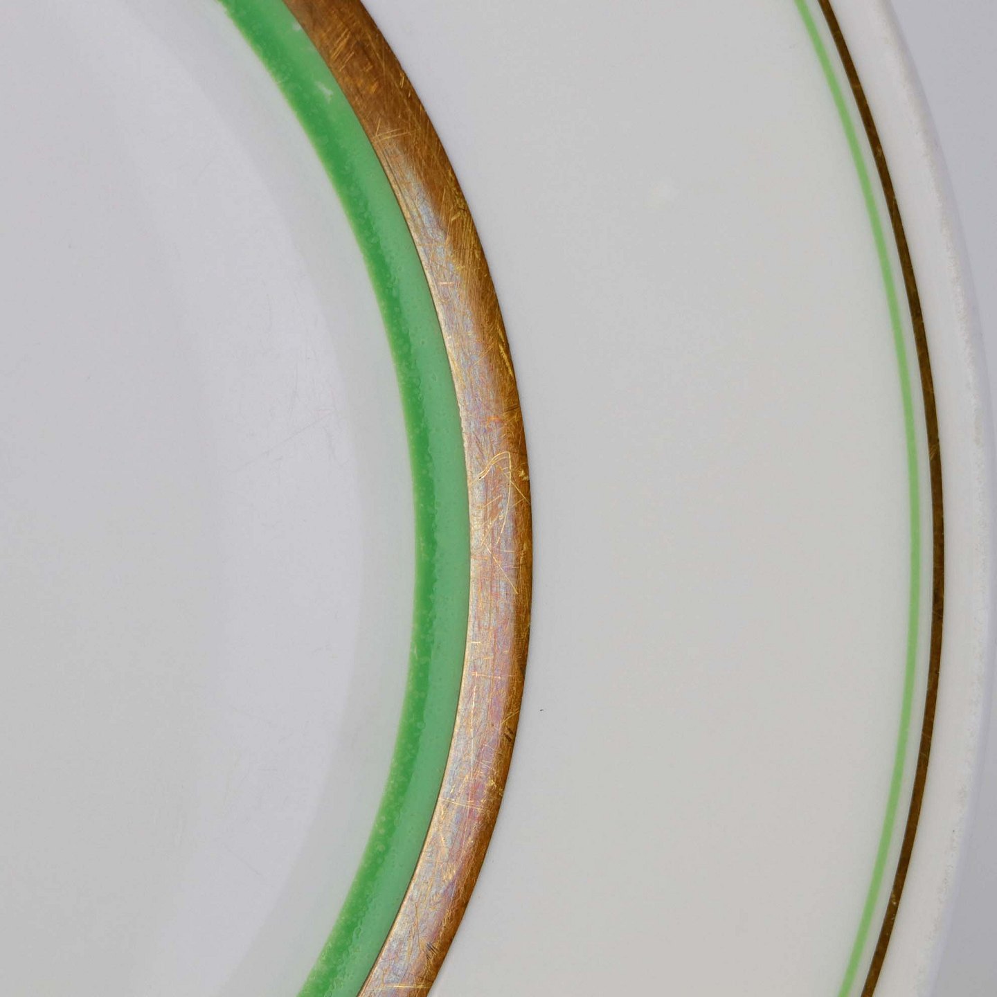 Service i glat hvidt porcelæn med dekoration i grøn og gylden streg.