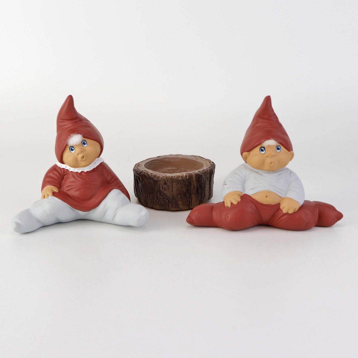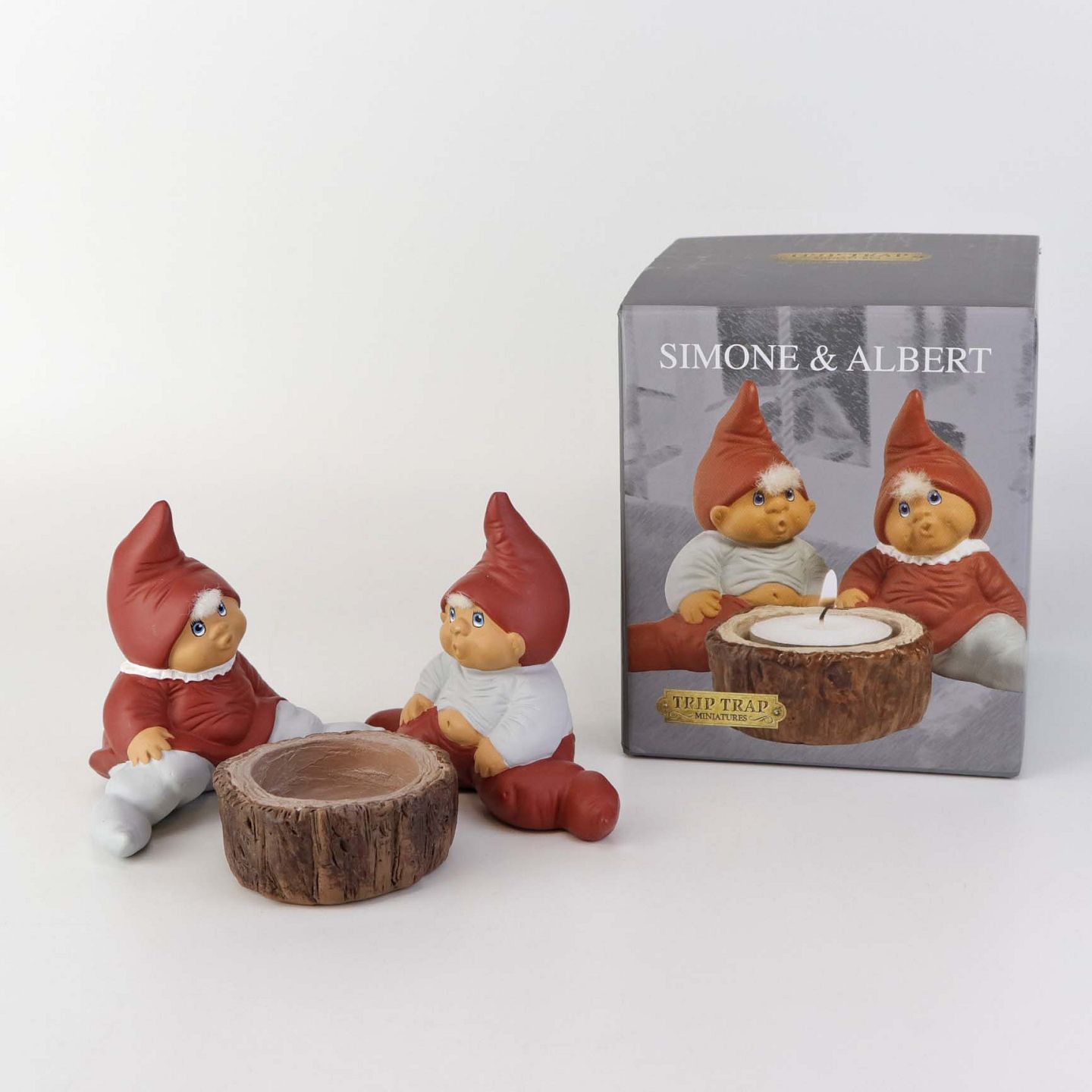Figursæt med motiv af nisserne Simone og Albert med tilhørende fyrfadsstage fra serien Klarborg jul år 2021. Figurene kommer med original boks.Design Etly Klarborg
