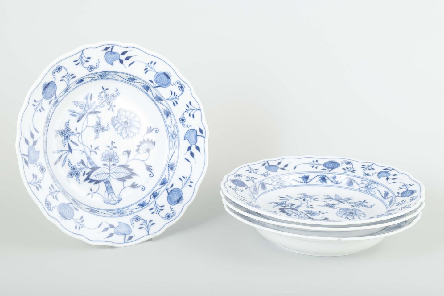 Fire håndmalede dybe porcelænstallerkener i det klassiske “Løgmønstret” (Blue Onion) mønster. Dekoreret i underglasurblå med bølget kant og elegant ornamentik.