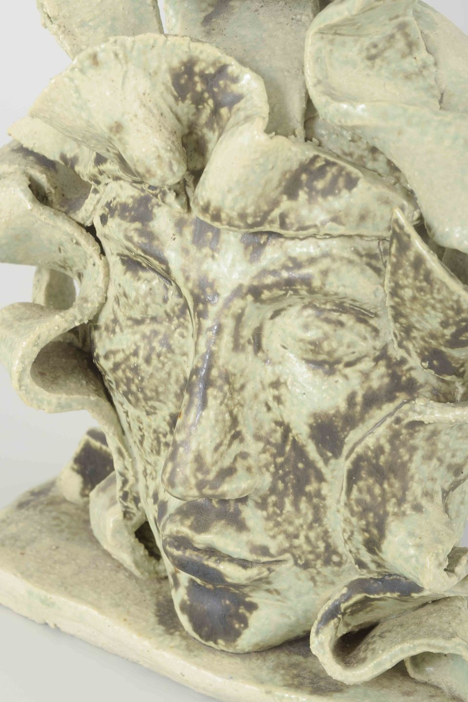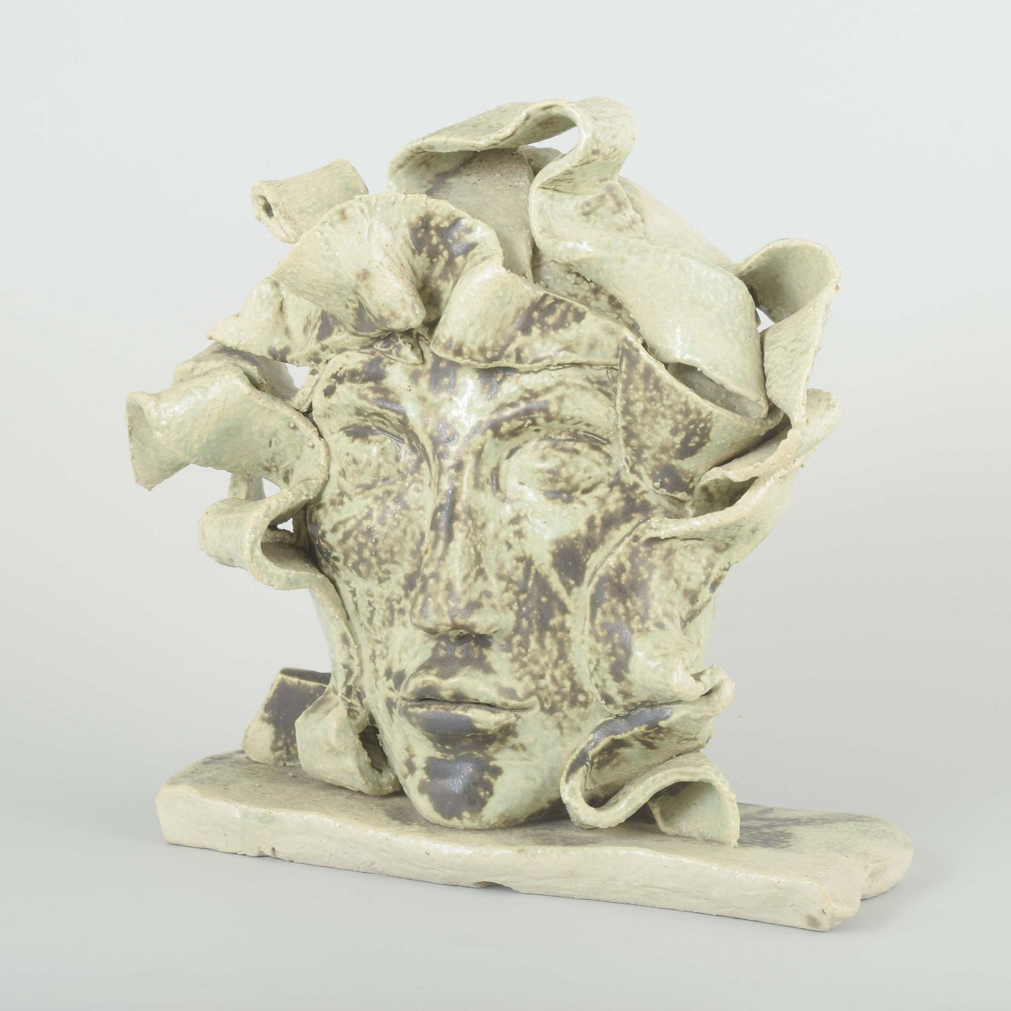 Unik håndformet hovedskulptur i stentøj med lys grønlig glasur og mørke kontraster. De bølgende, foldelignende former omkring ansigtet giver værket et ekspressivt og næsten surrealistisk udtryk. Signeret MH i leret.