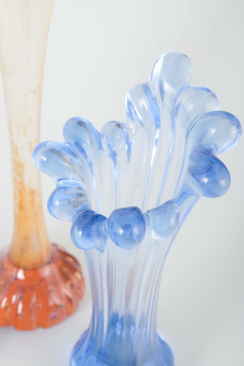 Organisk formede glasvaser i blå og rosa nuancer med karakteristiske bløde, frie former. Typisk for den svenske studioglasproduktion i 1970’erne, hvor farve og form blev brugt eksperimenterende og skulpturelt.