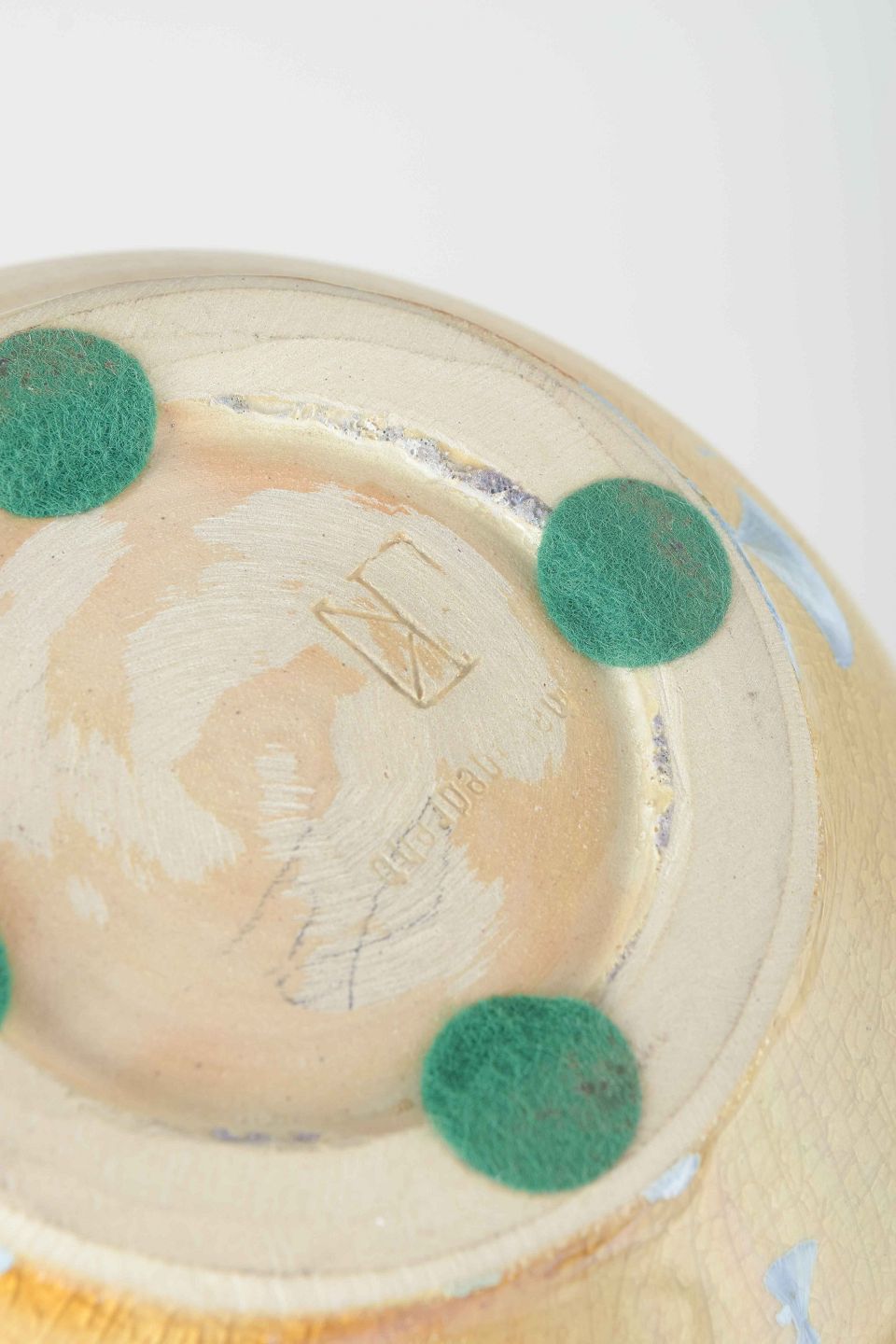Drejet stentøjsvase med krystalglasur i lyseblå og beige nuancer. Dekorationen danner et organisk, næsten floralt mønster omkring skulderen. Signeret i monogram i bunden.