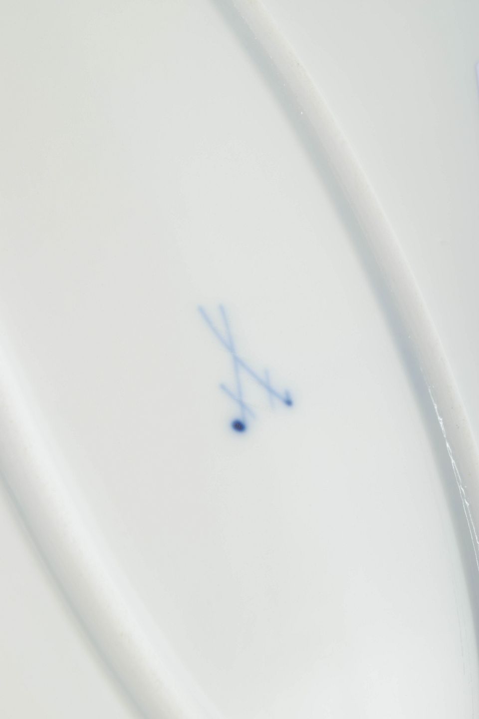 Elegant ovalt serveringsfad i porcelæn, håndmalet i det klassiske “Blue Onion” (løgmønstret) mønster i koboltblå. Dekoreret med stiliserede blomster, frugter og løgornamentik – et ikonisk Meissen-design siden 1700-tallet.