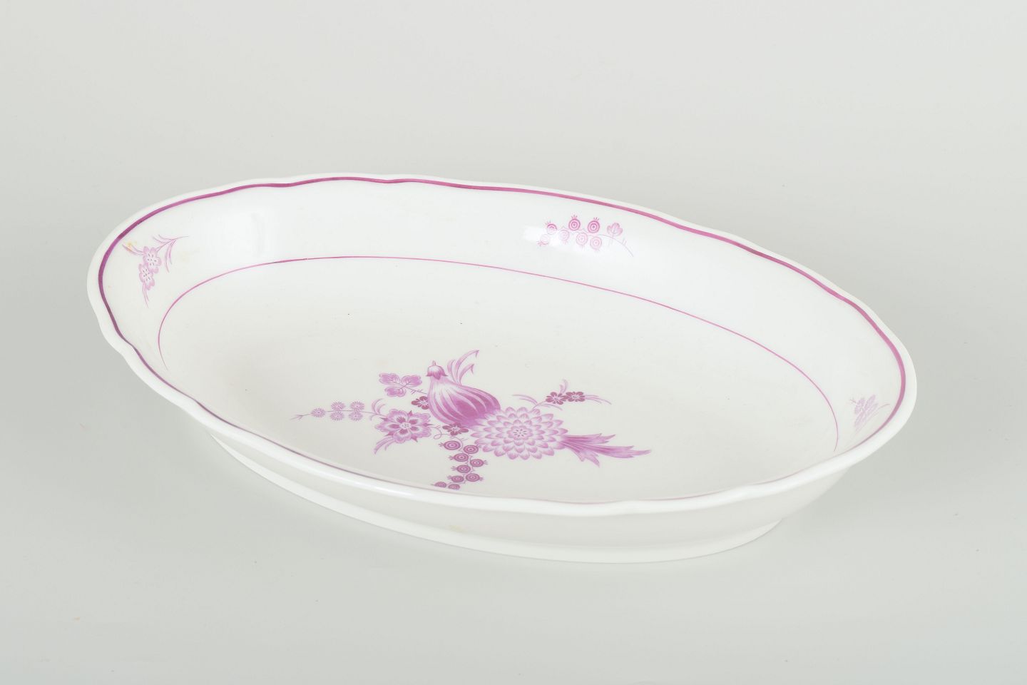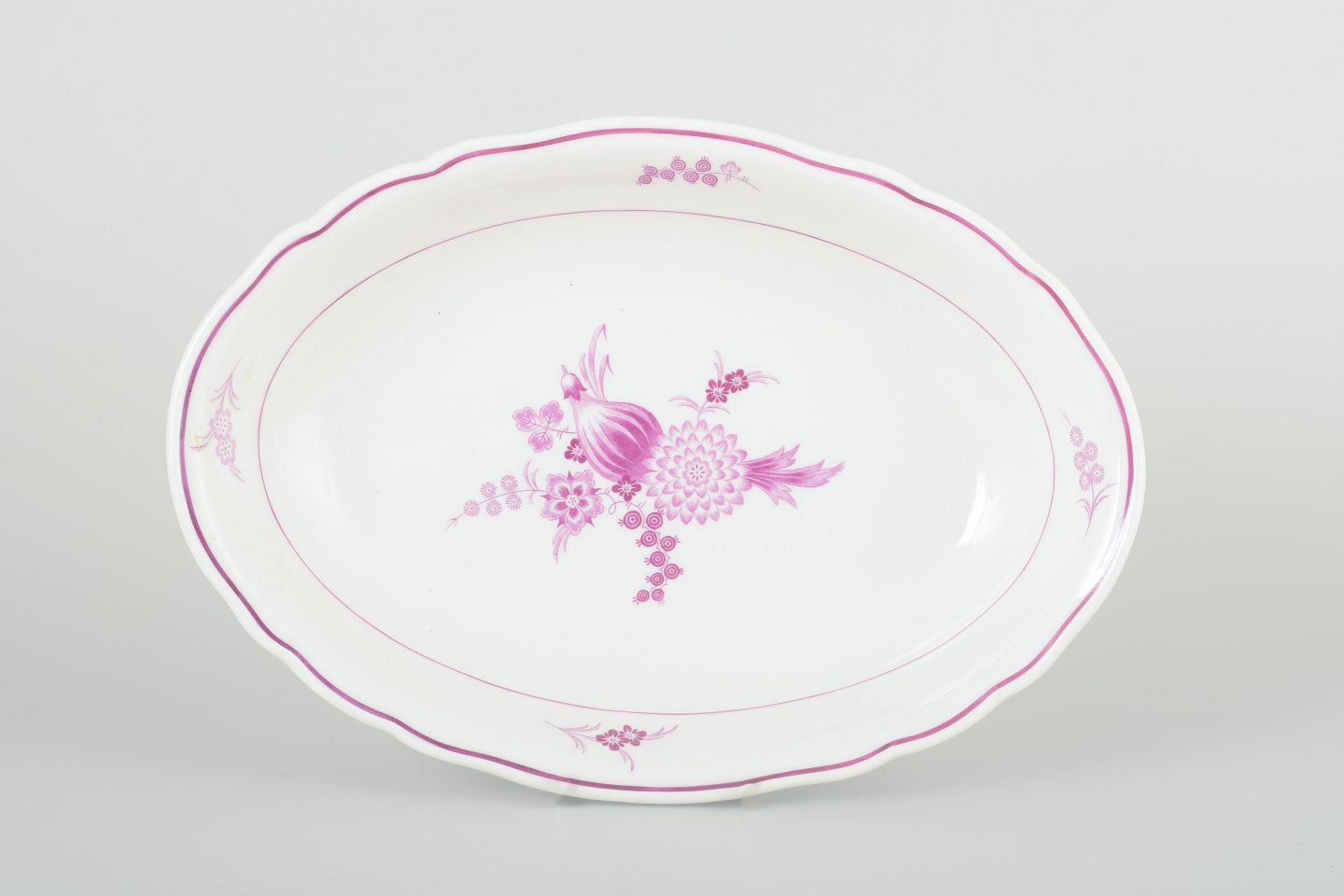 Håndmalet oval skål i porcelæn med dekor i lilla blomsterkompositioner og let bølget kant. Klassisk Meissen-design med elegant staffering i rosa toner.