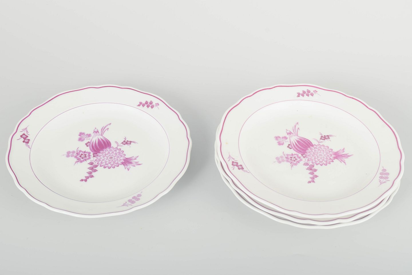 Sæt af fire håndmalede frokosttallerkener i porcelæn med dekor i lilla blomsterkompositioner og let bølget kant. Klassisk Meissen-design med elegant staffering i rosa toner.