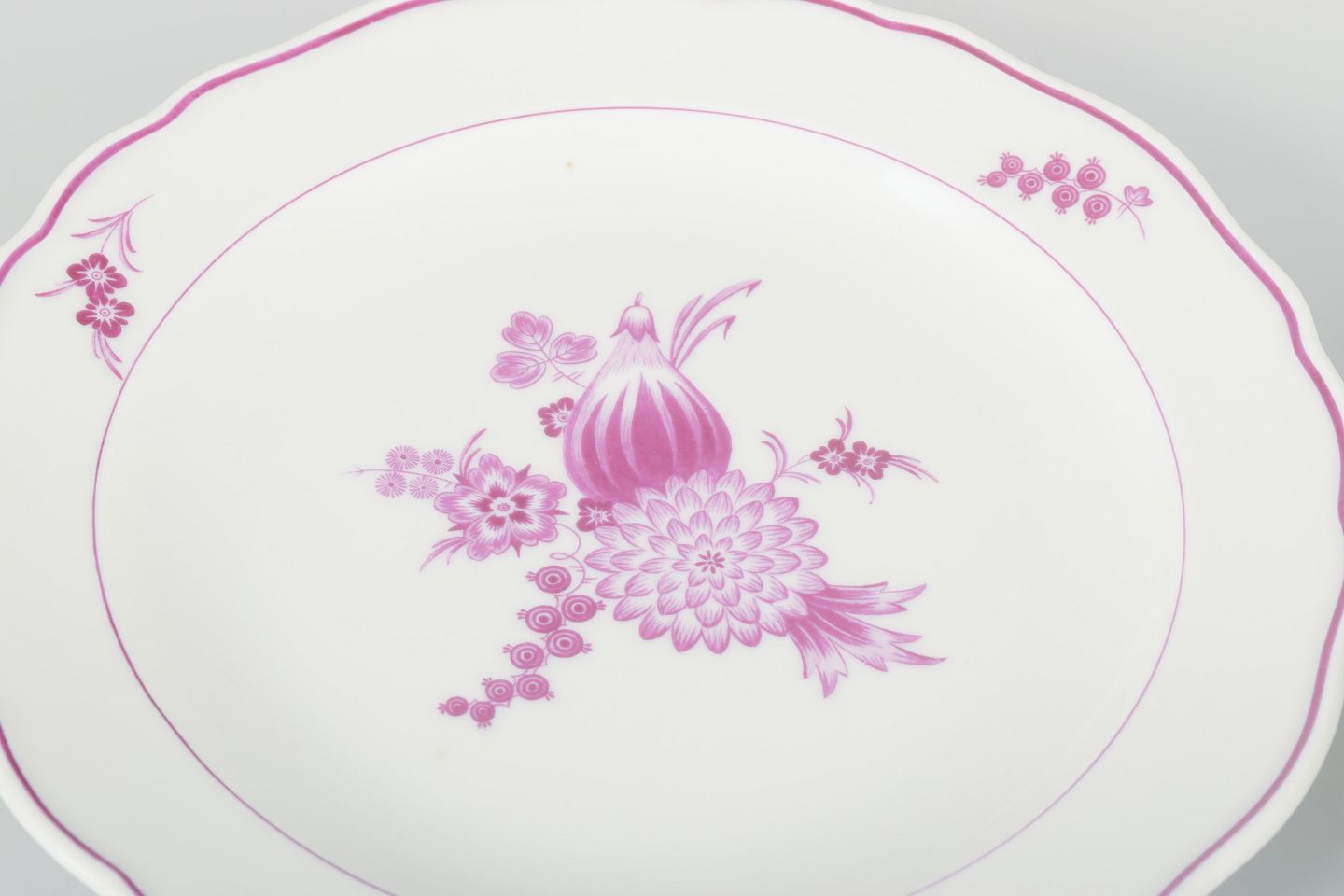 Meissen har siden begyndelsen af 1700-tallet været Europas førende porcelænsfabrik, kendt for sin håndmalede dekoration og tekniske perfektion. I 1930’erne blev de klassiske blomsterdekorer genfortolket i mere afdæmpede farver, som her i lilla, hvilket giver et elegant og tidstypisk udtryk.