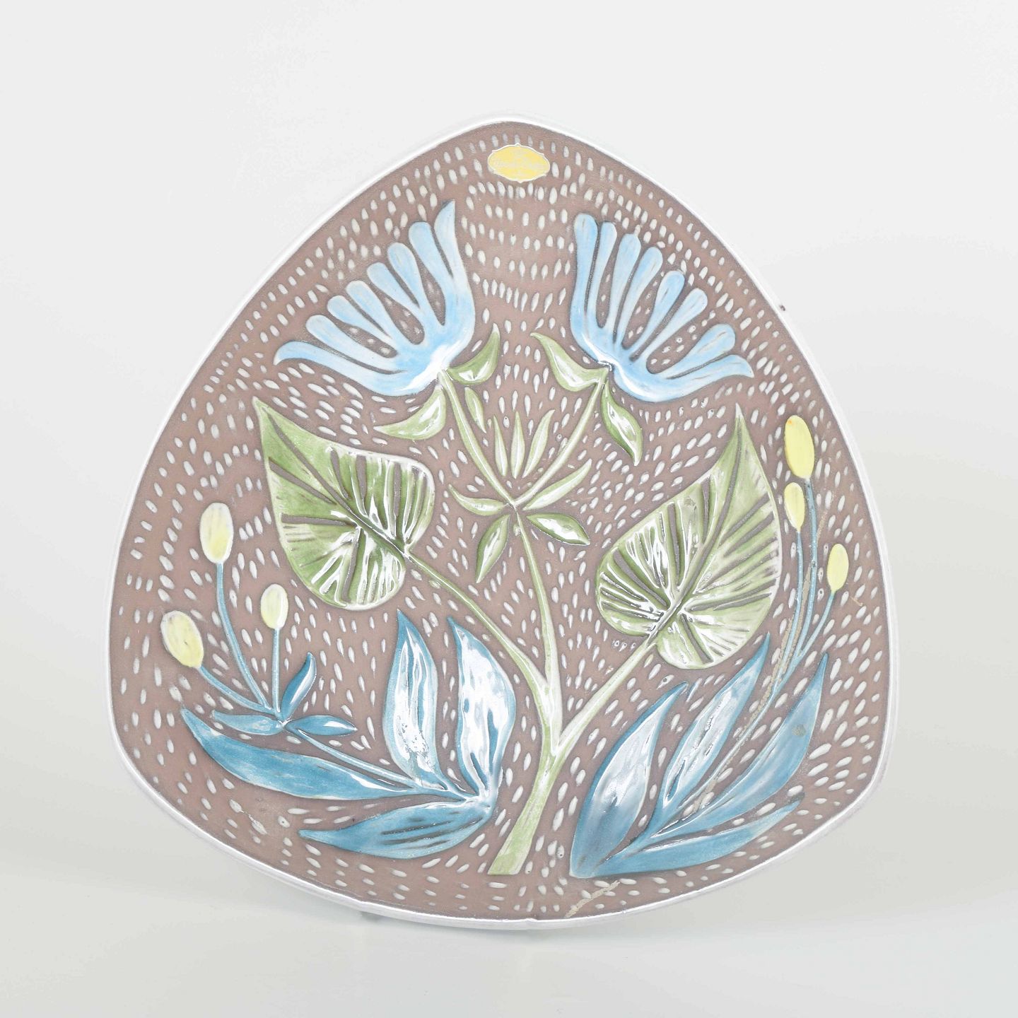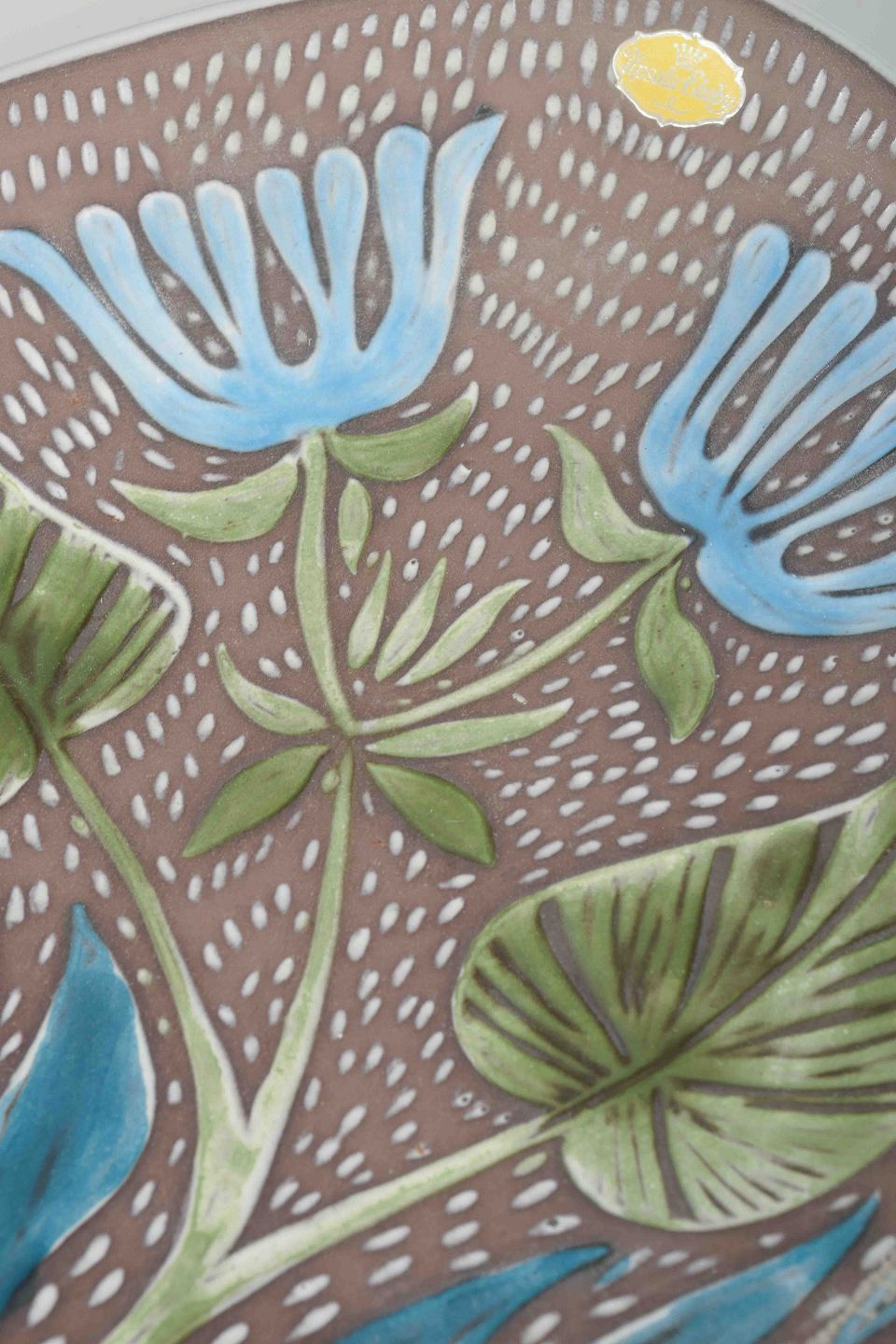 Dekorativt fad i glaseret keramik med reliefmønster af blomster i blå, grønne og hvide nuancer mod brun baggrund.