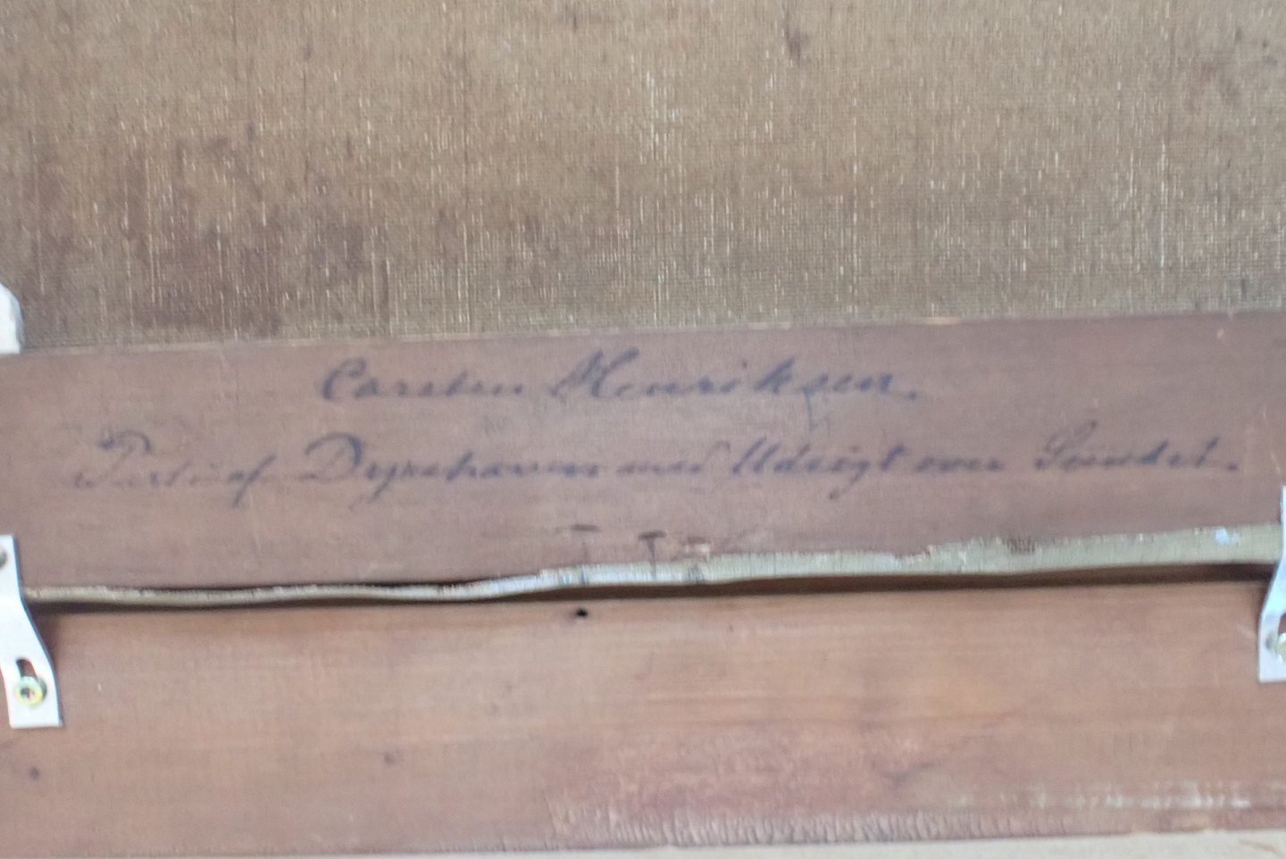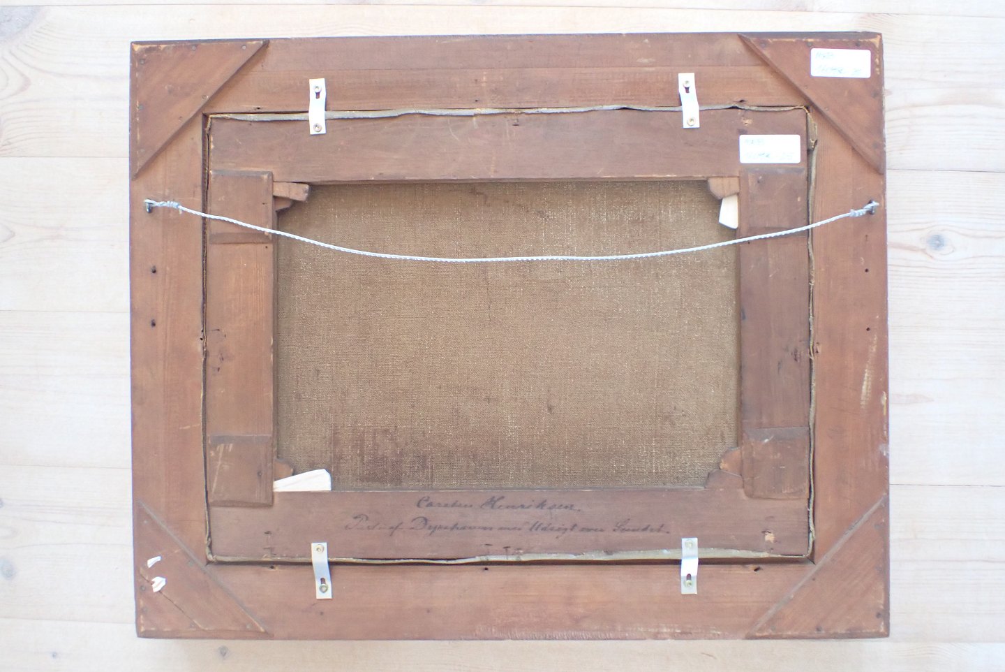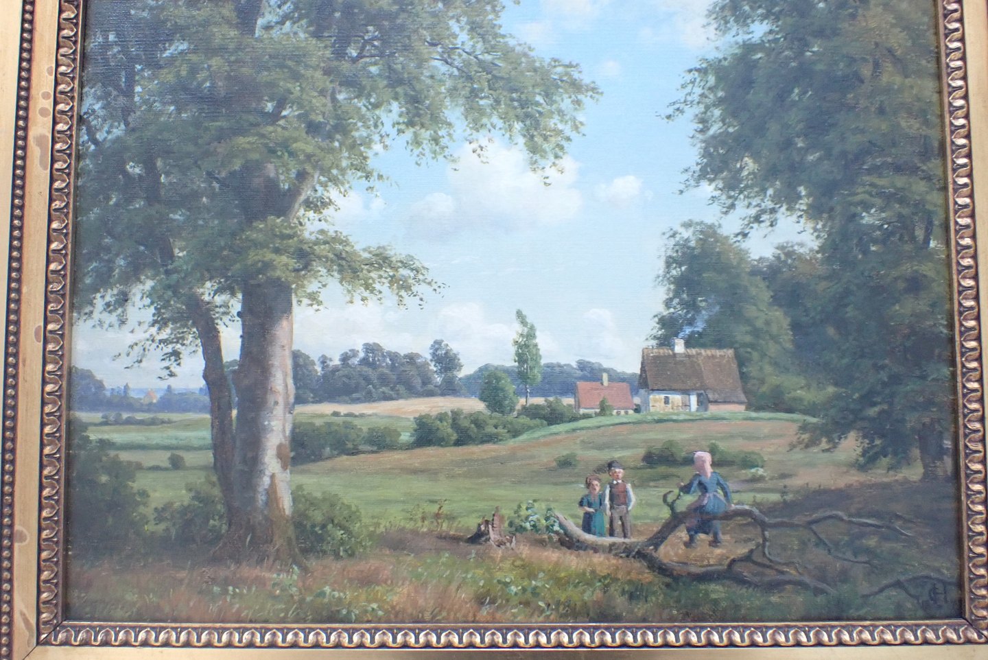 Carsten Hentichsen (1824 - 1897) - indrammet maleri. Olie på lærred. Signeret med initialer CH 1871. Fuld signeret på bagsiden med beskrivelse : "Parti af Dyrehaven med udsigt over Sundet".Børn i forgrunden. Formodentlig daværende udsigt over eksisterende hus nær strandvejen ved Springforbi. Mål: 29 x39 cm. med ramme: 39,5 x 49,5 cm. I fin nyrestaureret stand af professionel konservator. Udstiller