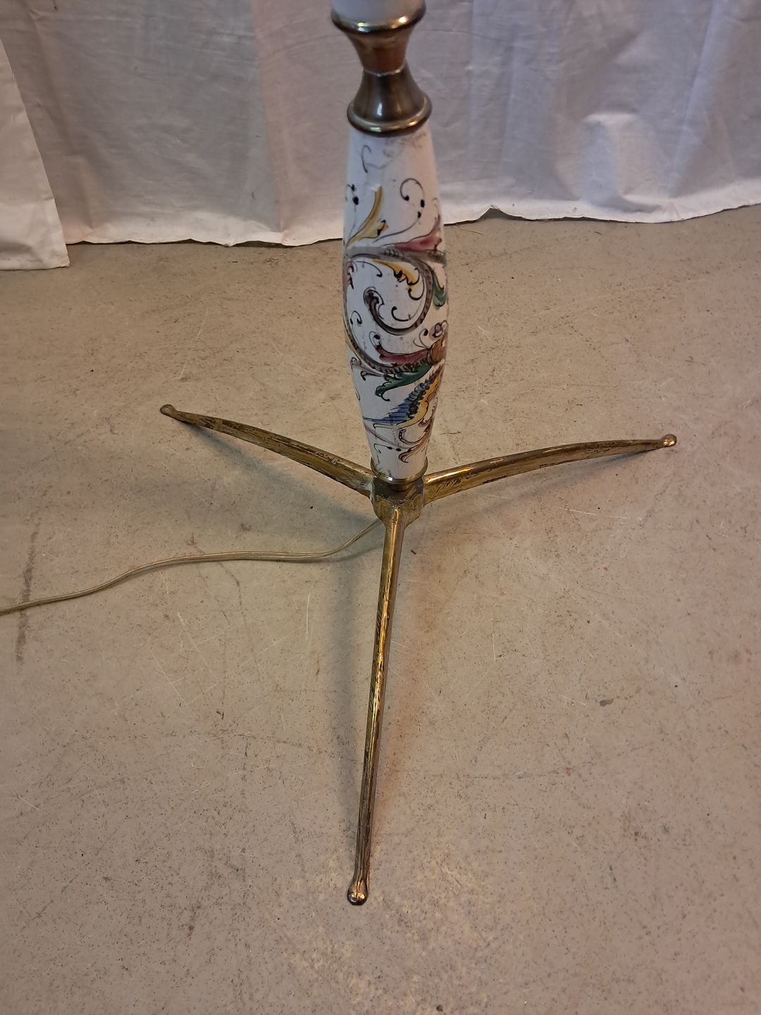 Gulvlampe i metal og pocelæn med skærm, fra 1980erne.Den har brugsspor.