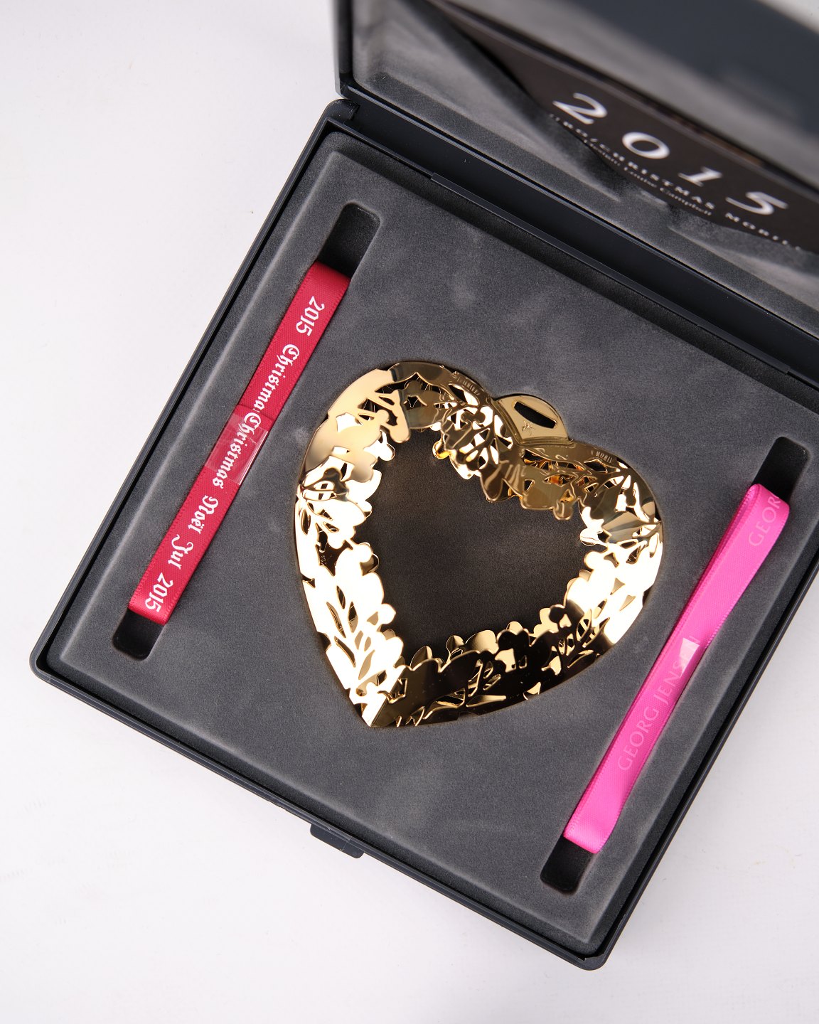 Georg Jensen juleuro 2015. Hjerte belagt med 24 kt. guld. H: 9 cm, B: 9 cm. Klassisk dansk julepynt og samlerobjekt.— Producent: Georg Jensen
