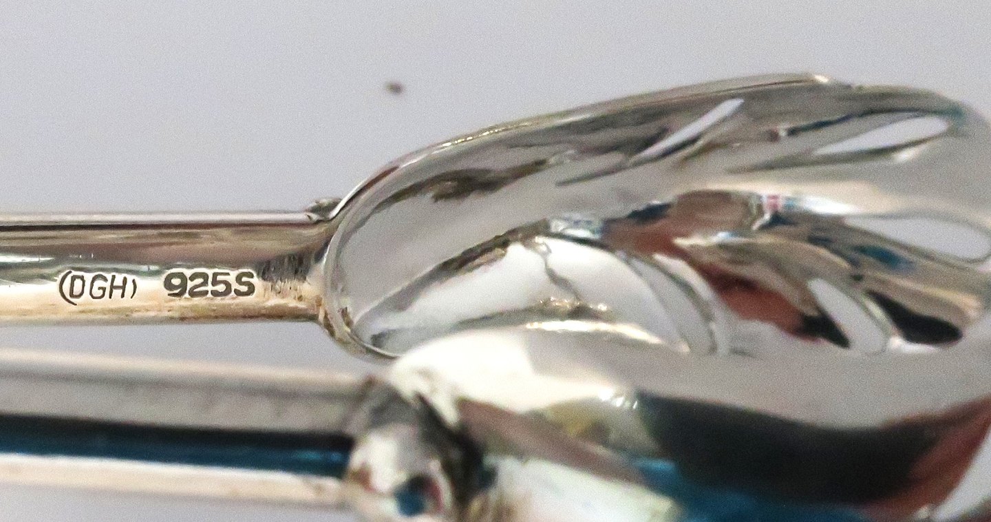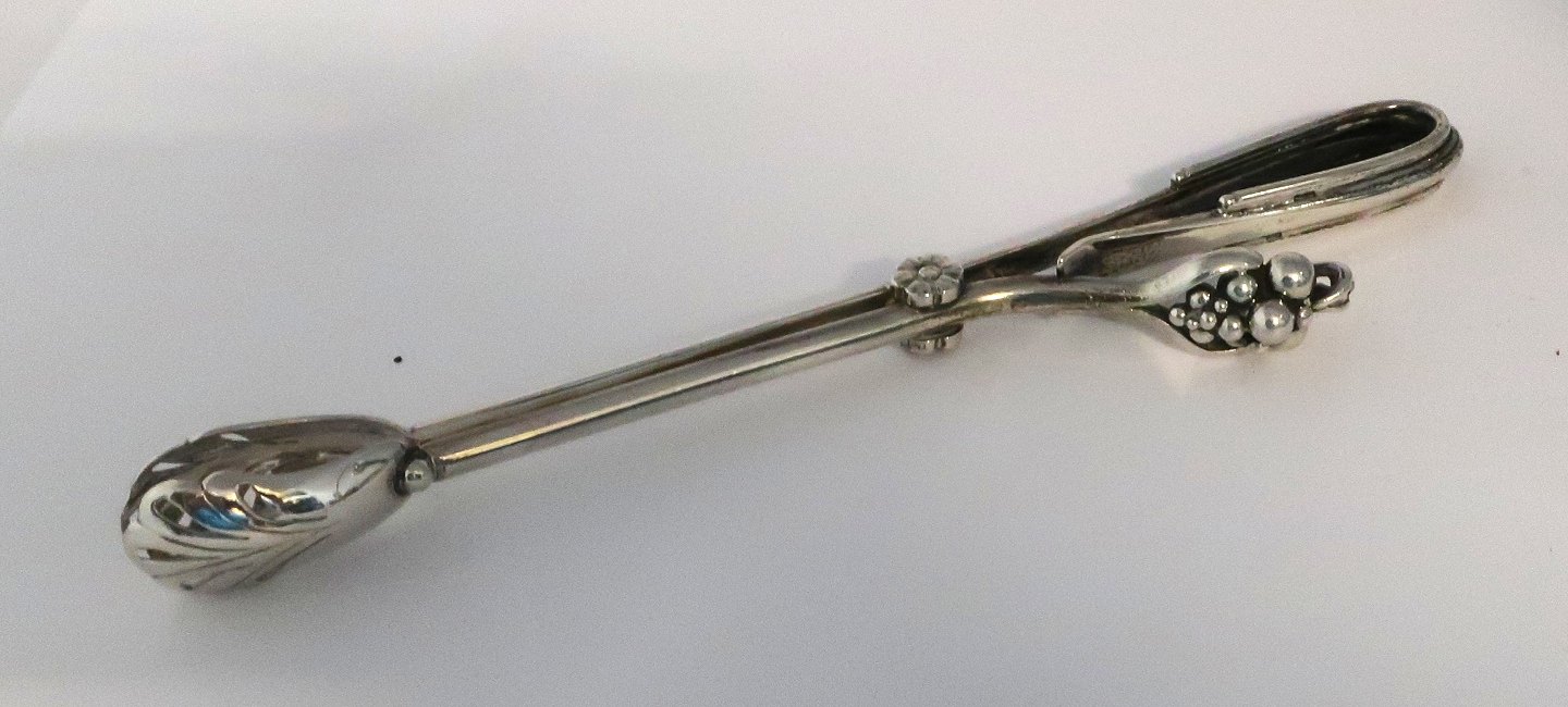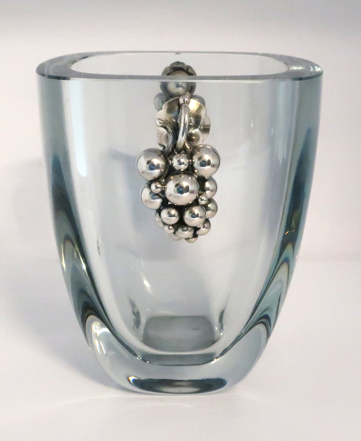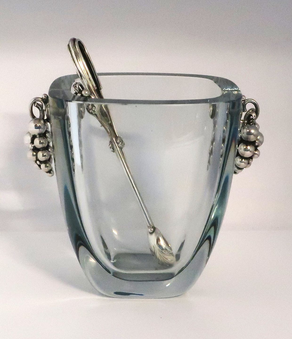Dansk Guldsmede Haandværk, (DGH). Holmegaard isspand med sterling håndtag i form af en drueklase. Højde 15,5 cm. Bredde 13 cm. Medfølger tilhørende istang i sterling sølv. Udstiller