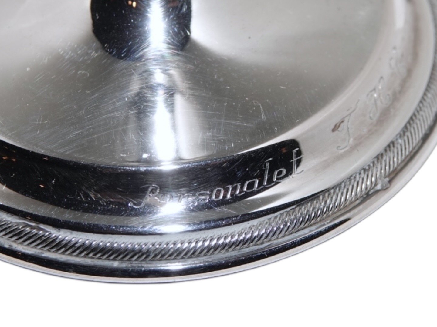En lysestage har indgravering på bundkanten "PERSONALET FHL 1-11-1959", se to nærfotos. Ellers fin stand.