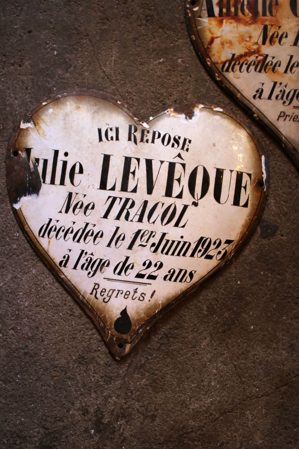 Dekorative , gamle franske minde hjerter i jern og emalje med skrift med patina tilbage fra år 1923 / 1925.Hjerterne er mindeplader fra gravsted. Måler: 20x20cm.