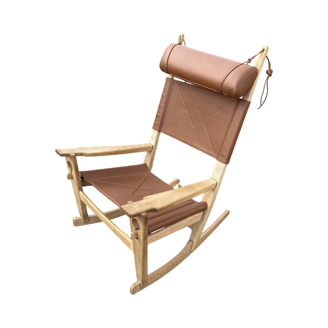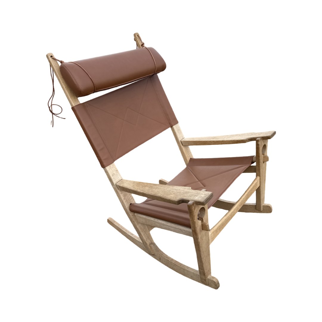 Hans J. Wegner – Gyngestol GE 673 “Nøglehullet” i eg m. nyt cognacfarvet læderElegant og eftertragtet Hans J. Wegner nøglehulsgyngestol, udført i massivt egetræ og nyligt ompolstret i cognacfarvet læder (fakturapris 6.000 kr., 3 mdr. gammel – dokumentation medfølger). Stolen fremstår flot, med lækkert patineringspotentiale og høj siddekomfort.