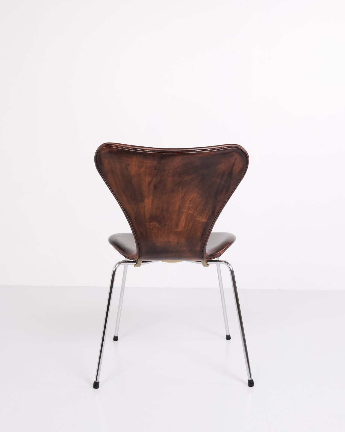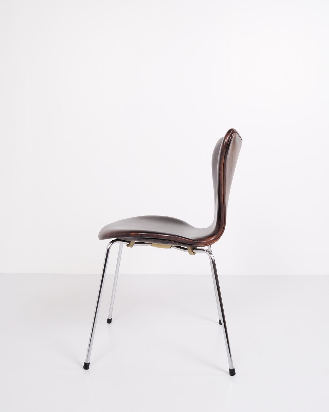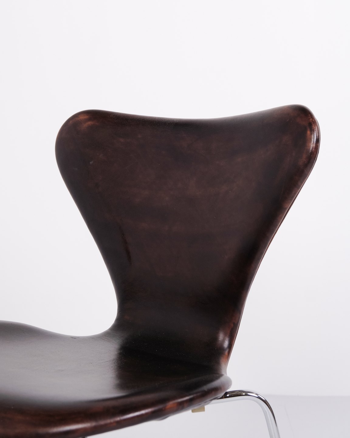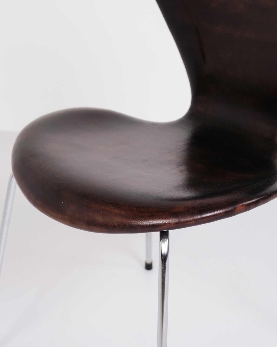 Sæt af seks Arne Jacobsen Syverstole, model 3107, fra Fritz Hansen. Brunt læder.— Oprindelse: Danmark