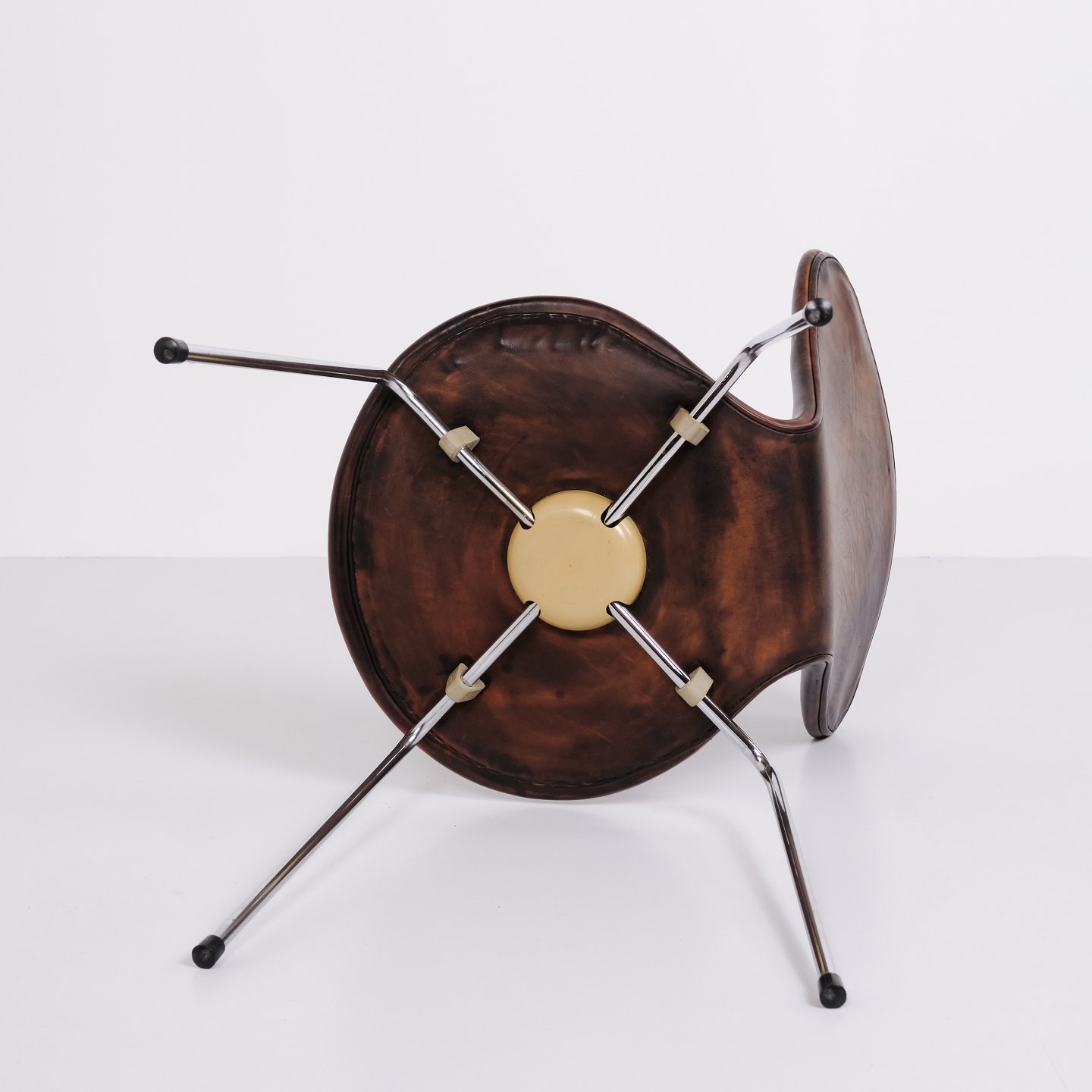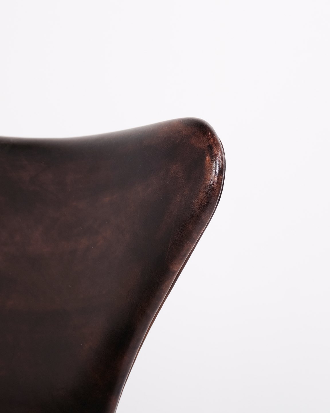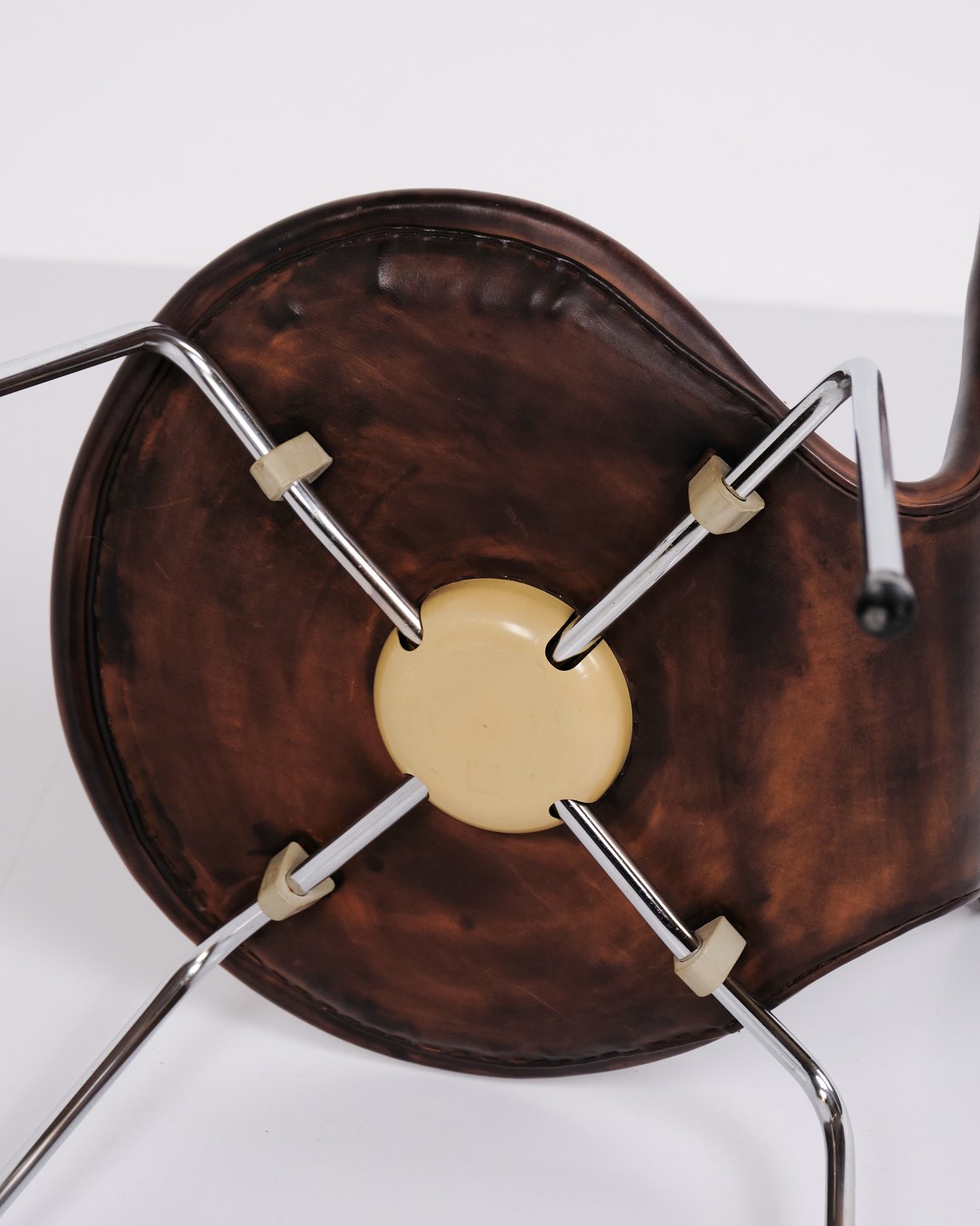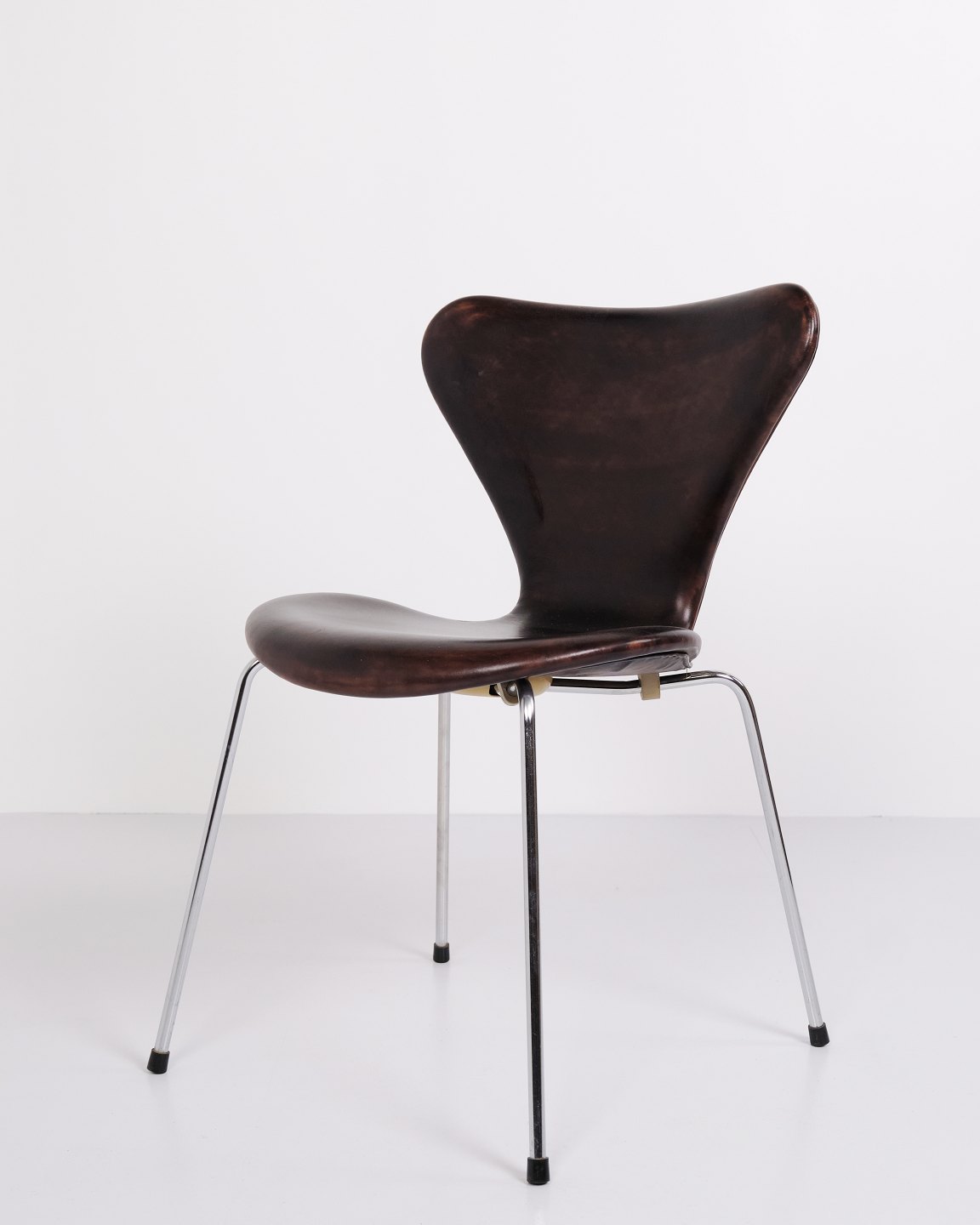Sæt af seks Arne Jacobsen Syverstole, model 3107, fra Fritz Hansen. Brunt læder.— Oprindelse: Danmark