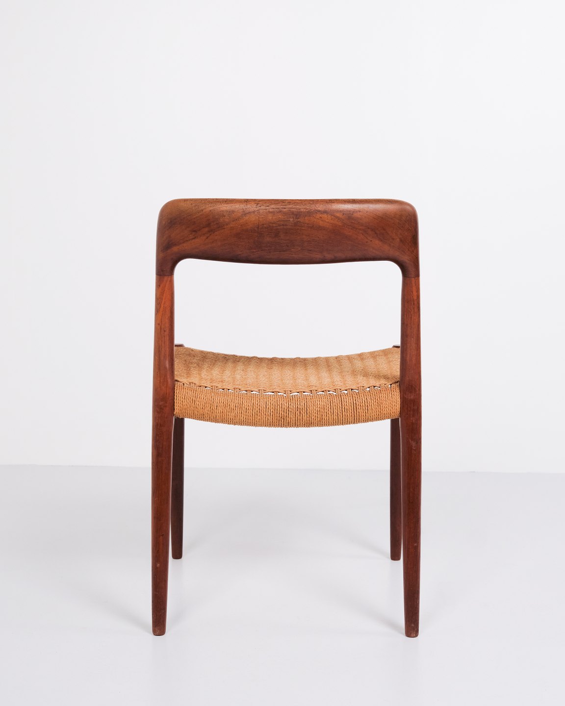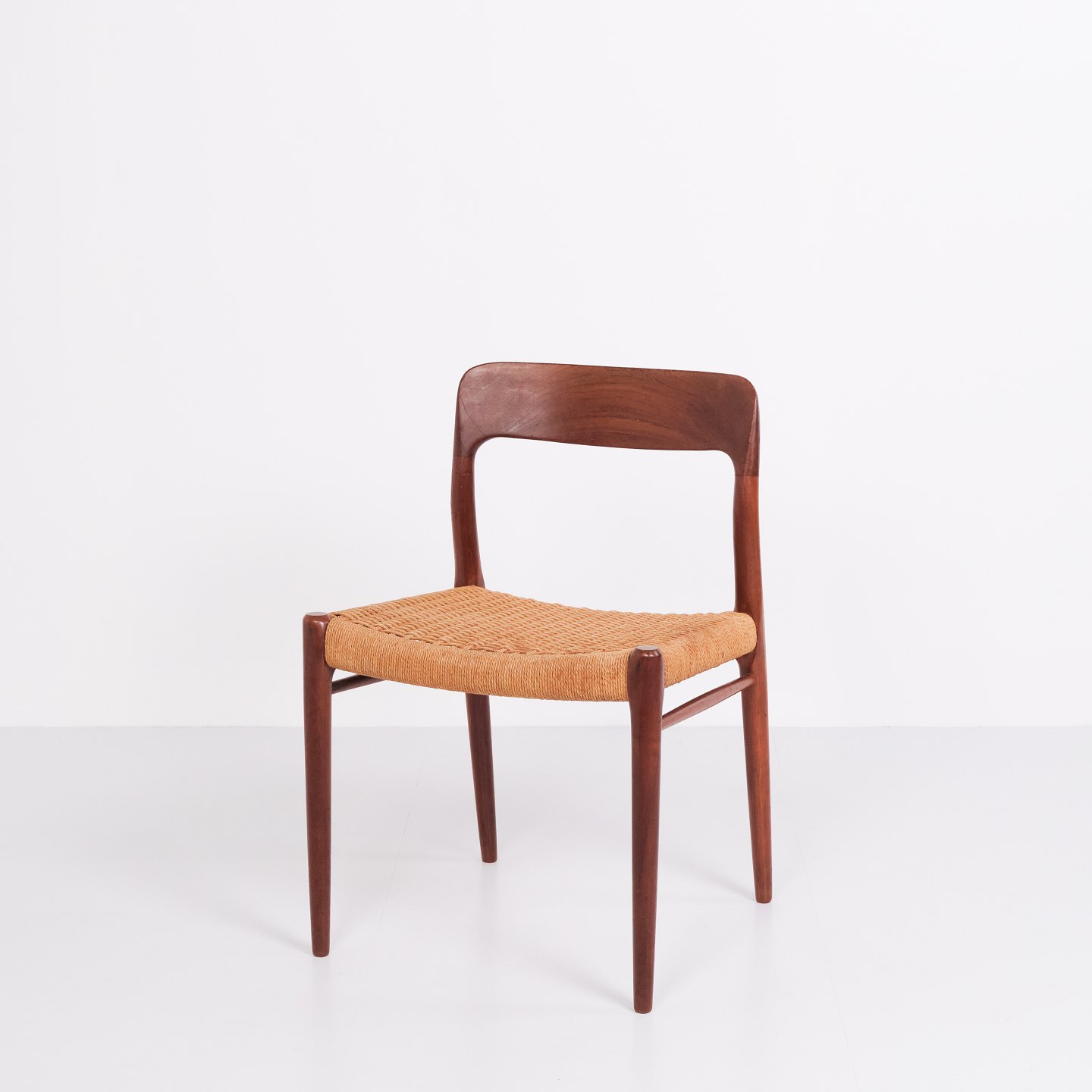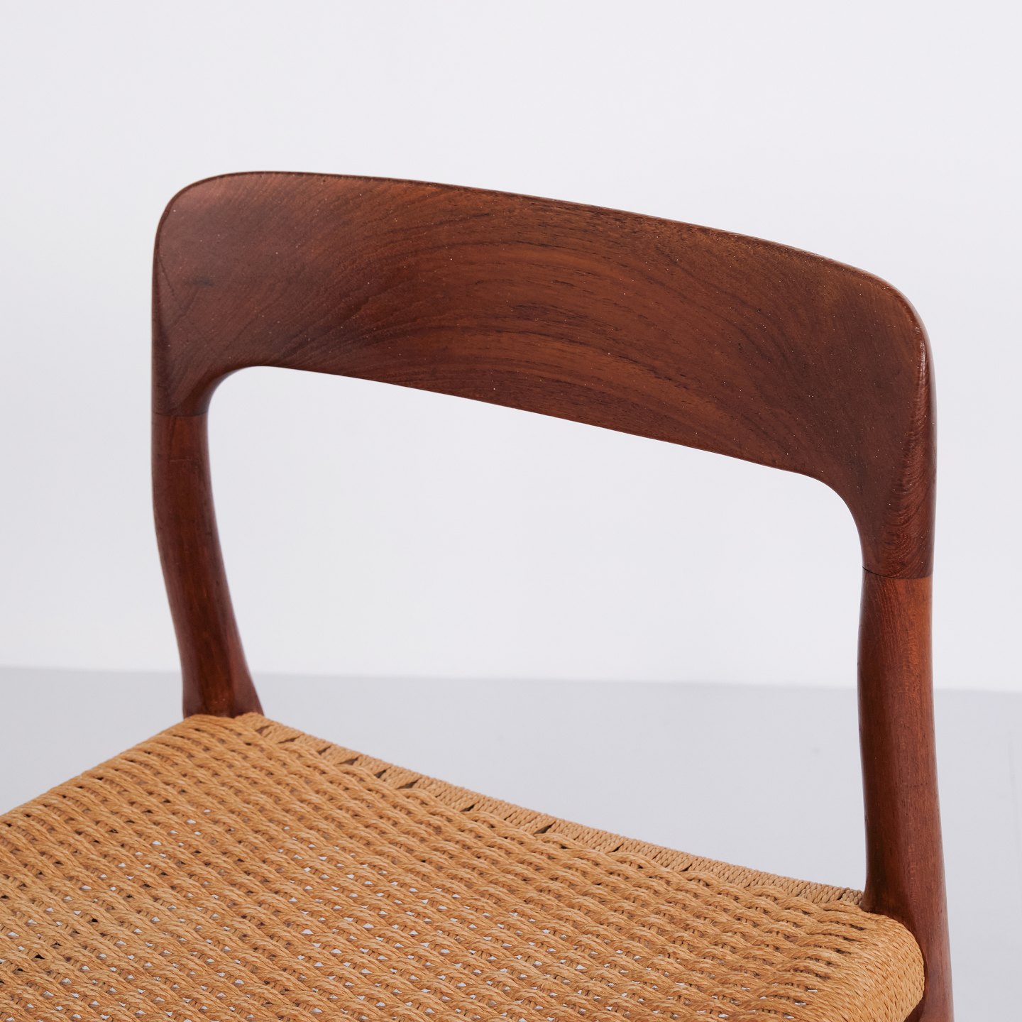 Sæt af Fem N.O. Møller spisebordsstole, model 75. Teak og papirflet, 1960’erne.— Oprindelse: Danmark